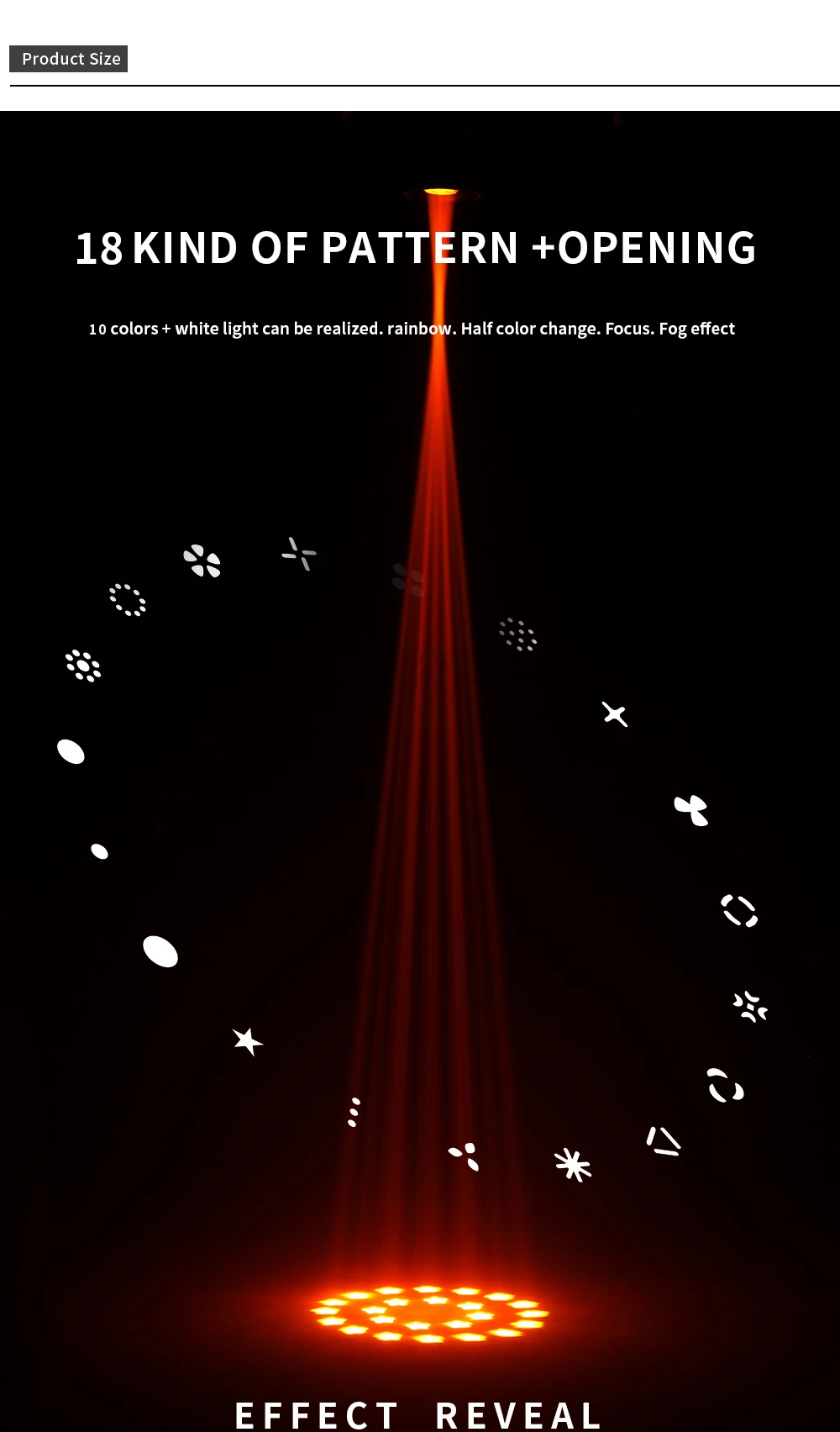 * Rueda de color: 10 colores + luz blanca, efecto de cambio de medio color