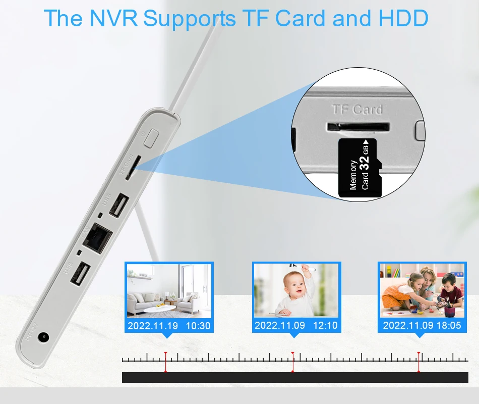 6. Mini NVR compatible con Wifi/cámara IP con cable, ranura para tarjeta Micro SD incorporada, compatible con puerto SSD, soporte máximo de tarjeta Micro SD de 128GB y HDD de 8TB 2,5 «(opcional en el momento de la compra)