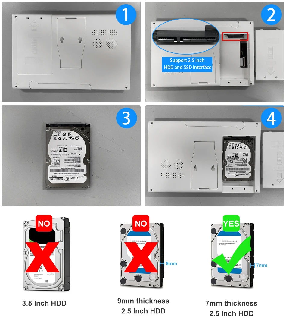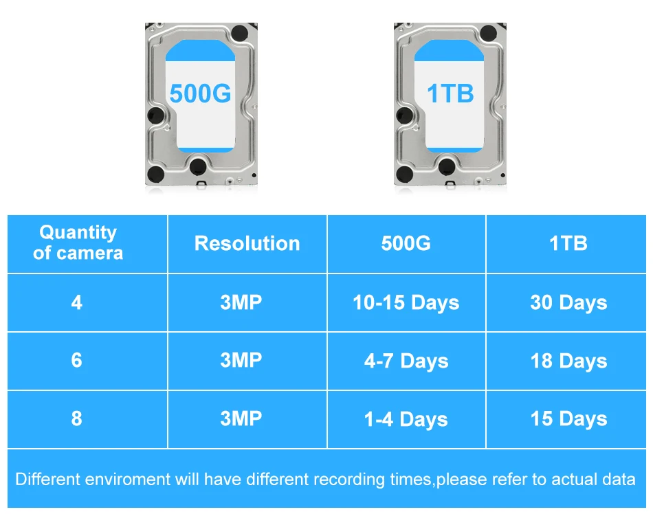 El disco duro es necesario para la grabación de vídeo, gracias a la tecnología de codificación de vídeo de alta eficiencia H.265, el disco duro de 1TB permite grabar continuamente aproximadamente 30 días de metraje de vídeo para 4 cámaras 500G puede grabar aproximadamente 15 días para 4 cámaras
