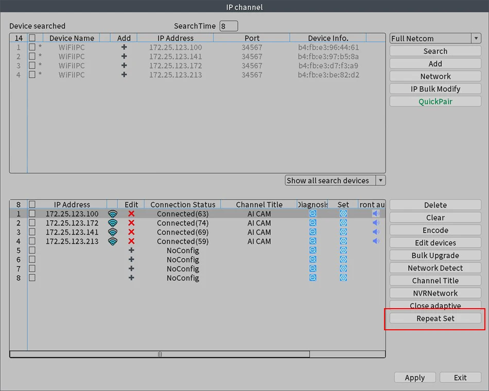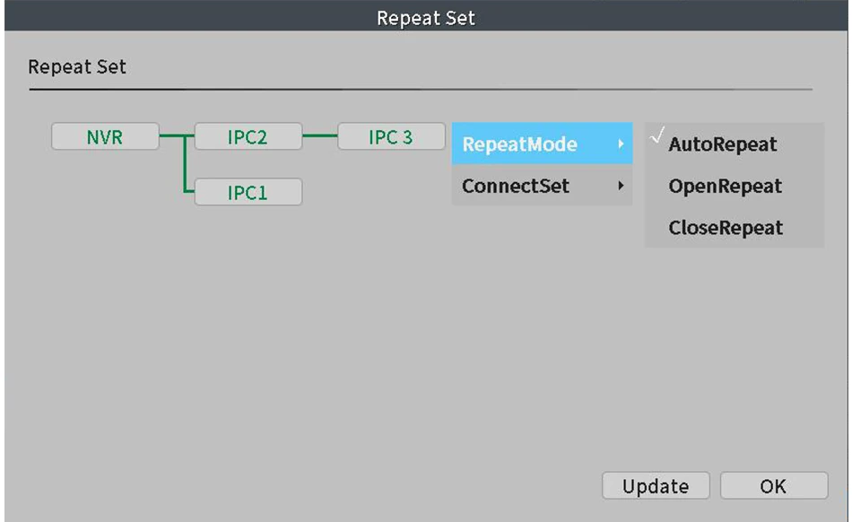 Hay tres modos de repetición: repetición automática, repetición abierta, repetición cerrada. En circunstancias normales, se recomienda configurar el modo de repetición automática, los modos de repetición se pueden configurar en el cuadro de opción emergente al hacer clic en las cámaras IPC correspondientes.