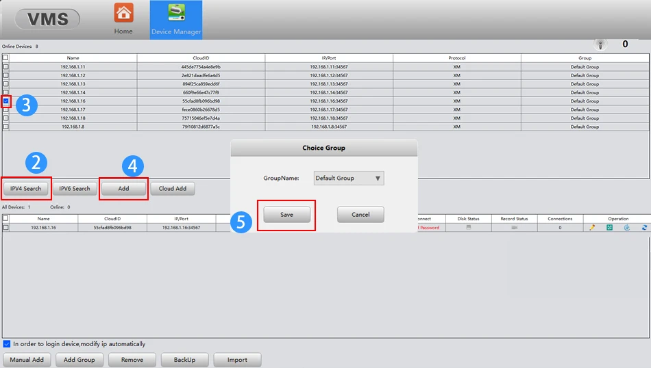 3. Por favor, haga clic en el dispositivo de búsqueda-elegir la dirección de la Cámara IP-Añadir-Guardar, buscar y cámara con éxito;