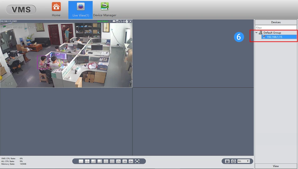 4. Haga clic en la vista en vivo, luego haga clic en la dirección IP del grupo predeterminado, luego podrá ver video.
