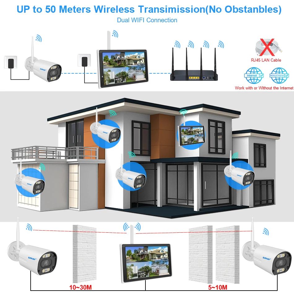 R: Esta distancia debe determinarse de acuerdo con el entorno in situ. Instalamos la cámara WiFi a unos 30 metros del NVR WiFi. Hay cinco paredes entre ellos. ¡Después de varias horas de pruebas in situ, su trabajo ha sido muy estable! Si su entorno es muy abierto, la Cámara WiFi y