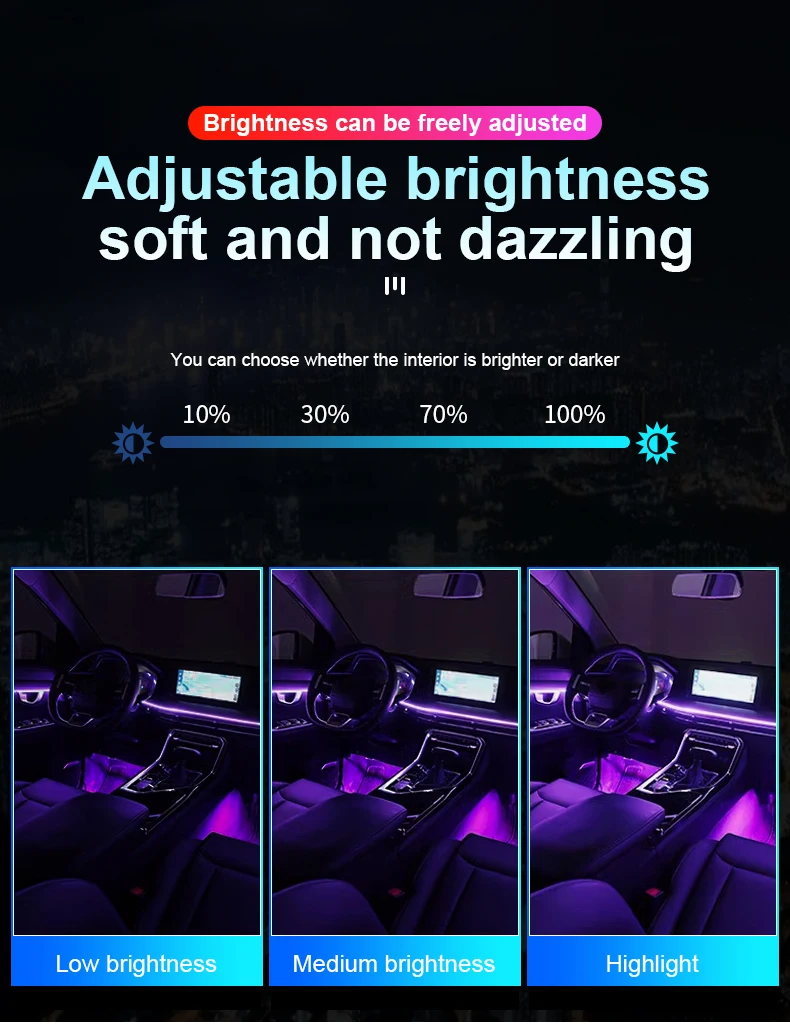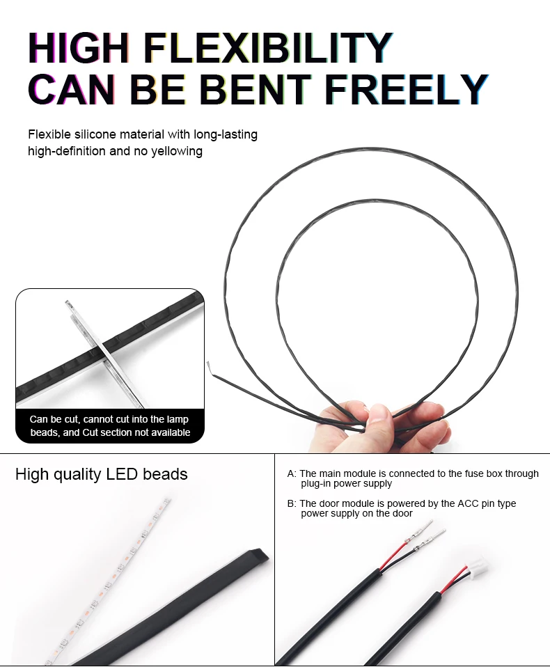 1) En el modo de zona única, toda la luz puede tener el mismo color, mientras tanto se agrega la función de zona dual, y la barra de luz y la luz de pie/luz de puerta/luz de almacenamiento proporcionan dos colores diferentes al mismo tiempo.