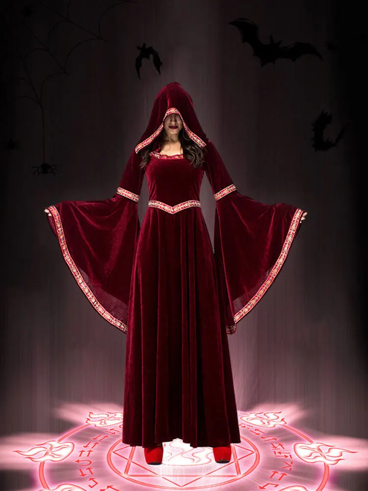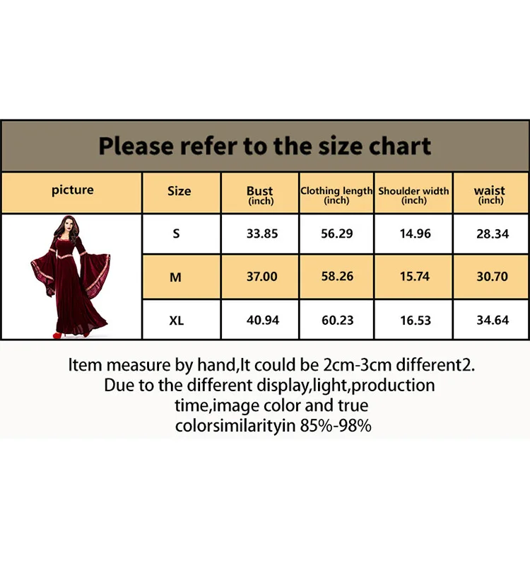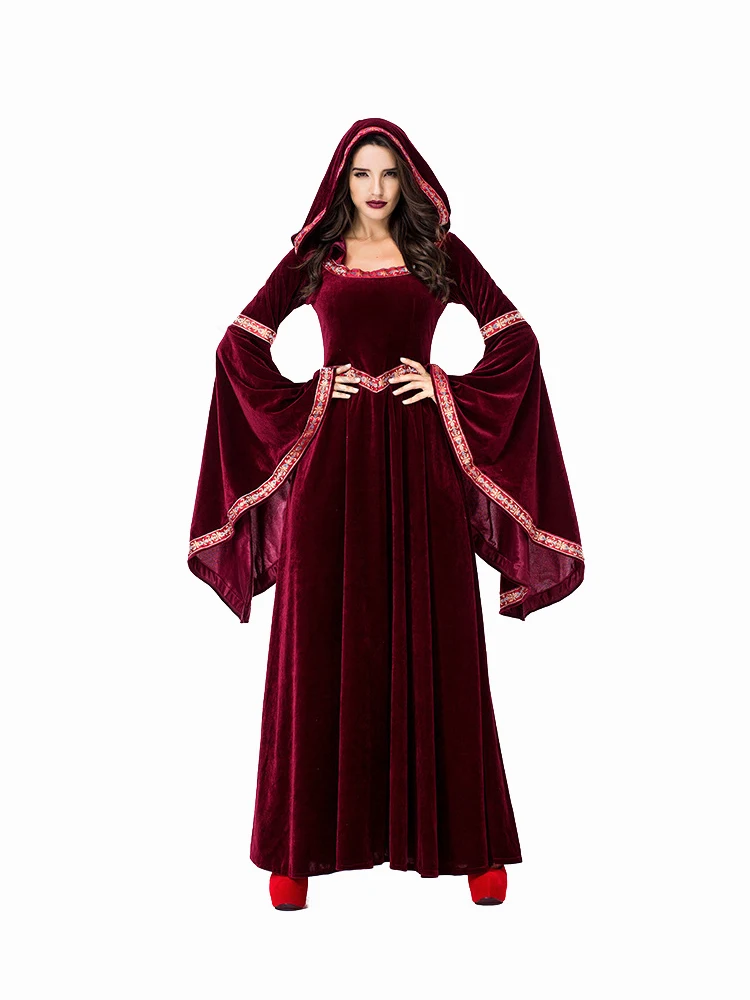 Vestido precioso, es espectacular. Color granate oscuro, la tela es de terciopelo ni muy gruesa, ni muy fina, capucha de gran tamaño. Trae una cremallera en la espalda para ponerlo mejor, el problema es que la cremallera es muy endeble, de mala calidad y la mía ha venido rota ni sube ni baja. Por lo demás una compra 10
