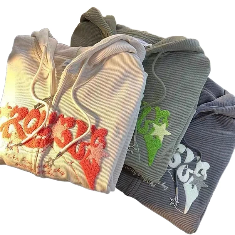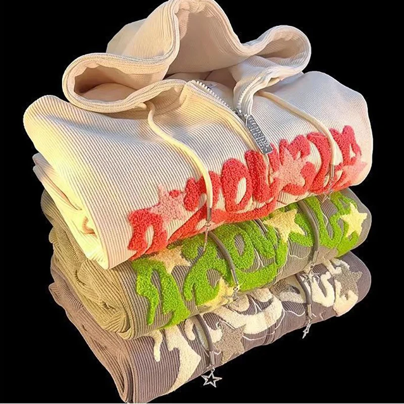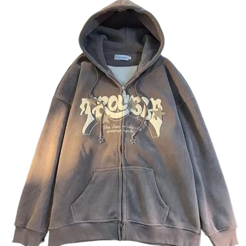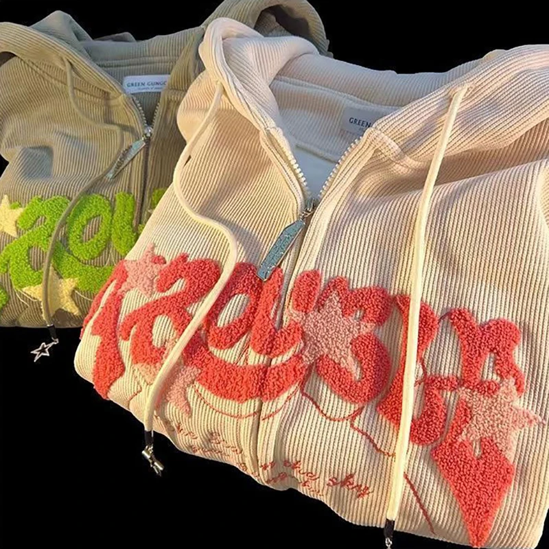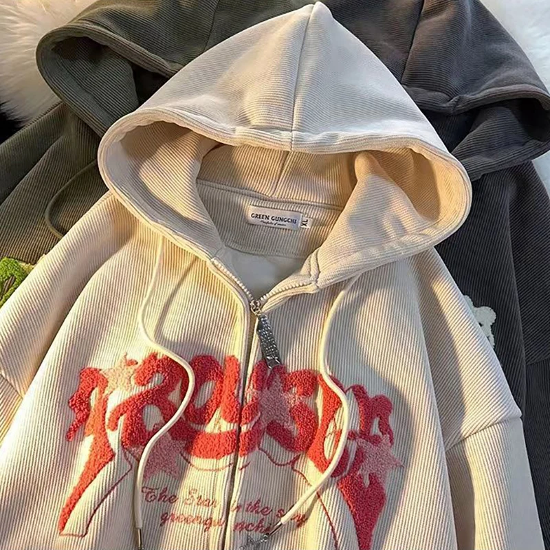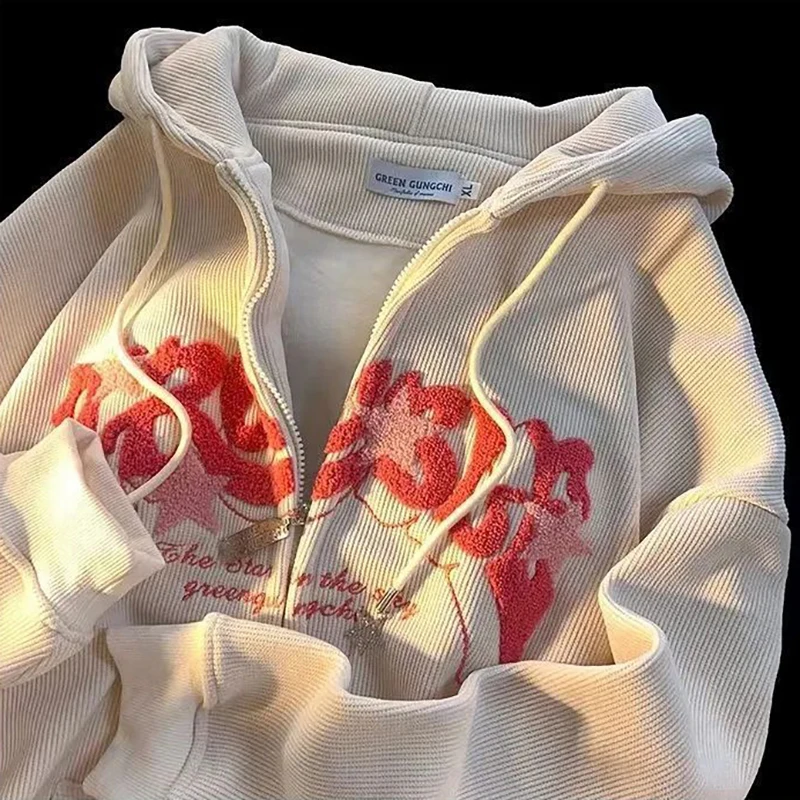 Sudaderas con capucha Retro bordadas para mujer, chaqueta holgada de manga larga con cremallera, abrigos informales con bolsillo Y2K, Otoño e Invierno