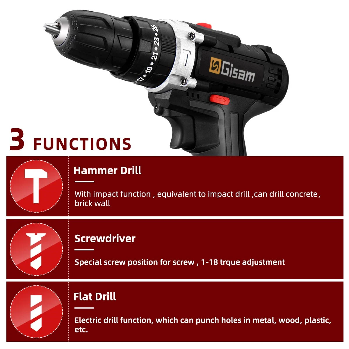-Control de 25+3 embragues, ofrece 25 configuraciones de torque y modos de perforación para diversas aplicaciones.
