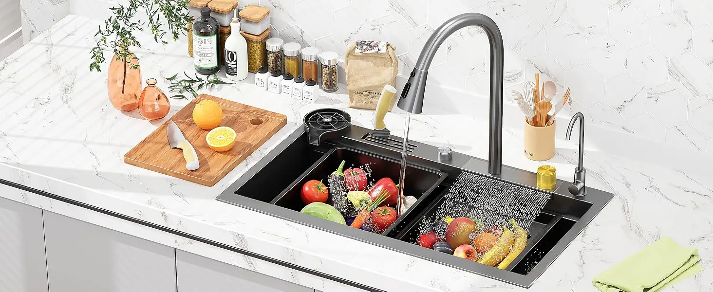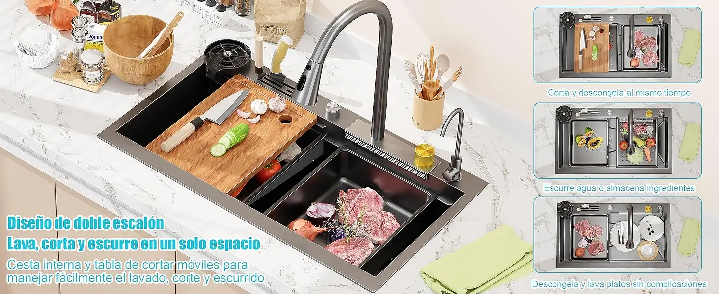 Diseño de doble nivel: Convierte tu fregadero en un espacio de trabajo multifuncional con una tabla de cortar de madera maciza, un lavabo interno y una cesta escurridora, lo que permite realizar tres funciones al mismo tiempo: lavar, cortar y escurrir. Este diseño maximiza el espacio y duplica la eficiencia en la cocina.