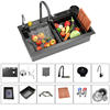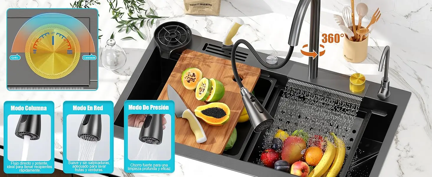 Grifo extraíble multifuncional: El grifo extraíble de 360°, con una extensión de hasta 50 cm, ofrece cuatro modos de salida de agua (columna, rociado, aclarado y cascada), adaptándose a todas tus necesidades. Además, el interruptor de drenaje manual te permite vaciar el agua sin mojarte las manos, manteniéndolas secas y limpias.