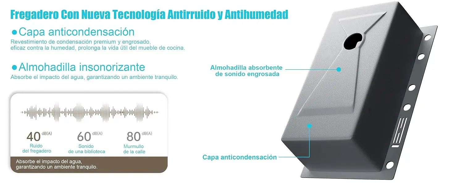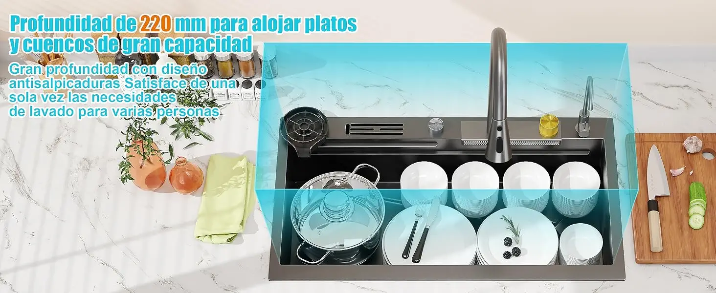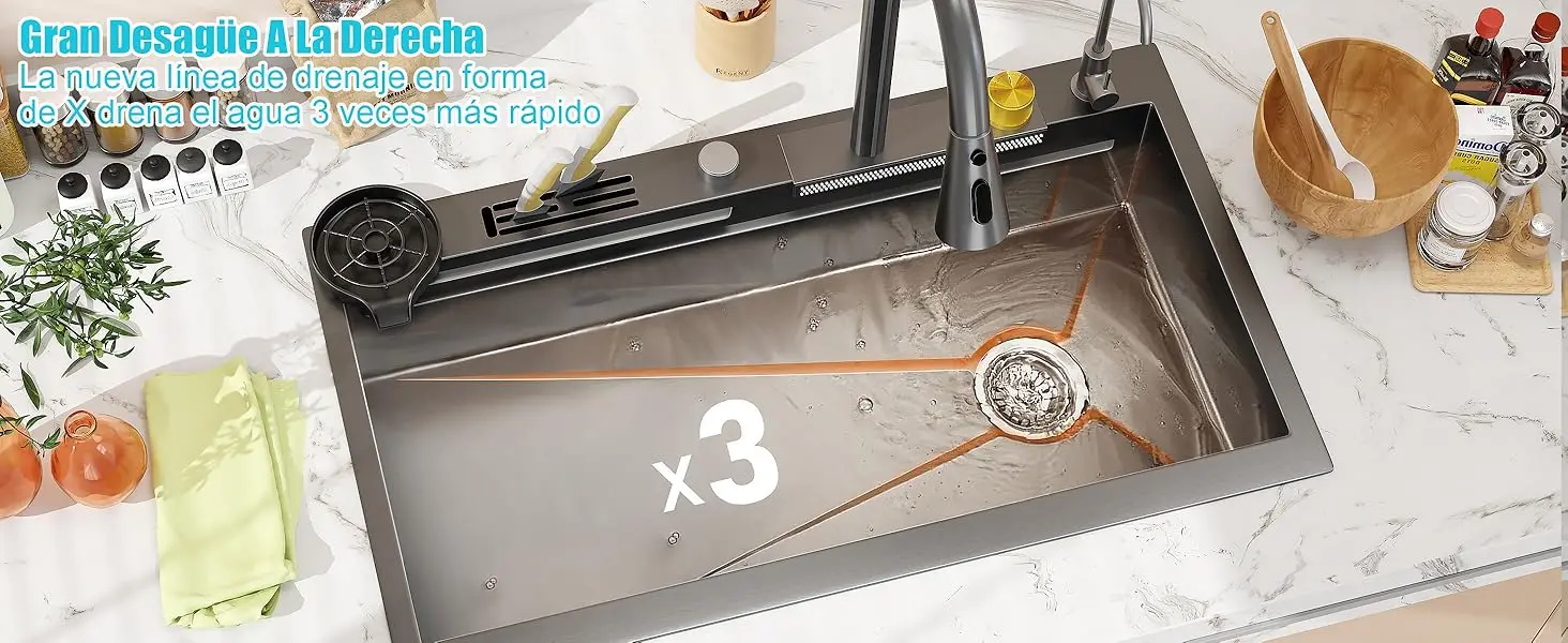 Drenaje eficiente y fácil limpieza: El diseño inclinado del fondo y las ranuras en X garantizan un drenaje rápido, evitando la acumulación de agua y manteniendo el fregadero siempre limpio y seco. Su gran capacidad permite lavar utensilios de gran tamaño sin problemas, mientras que las esquinas redondeadas facilitan la limpieza y el remojo de ollas y sartenes grandes.