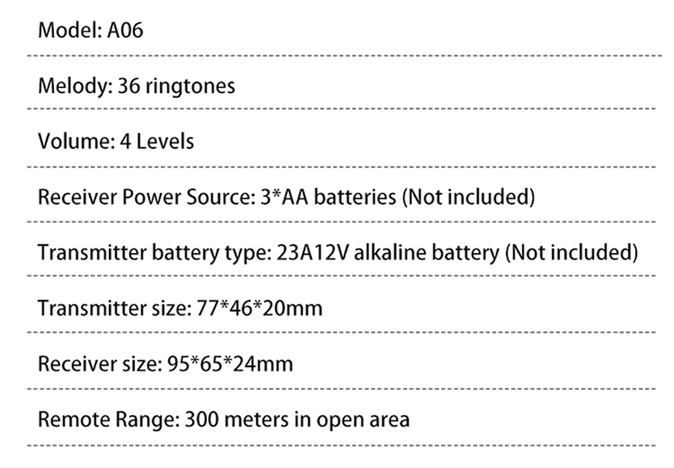 El timbre funciona perfectamente, la distancia entre el transmisor y el receptor es de aproximadamente 10 metros con paredes muy gruesas (edificio antiguo). Tenga en cuenta que hay una batería en el transmisor, pero necesita proporcionar 3 baterías de 2A para el receptor. Estoy muy satisfecho con mi pedido y recomiendo el timbre.