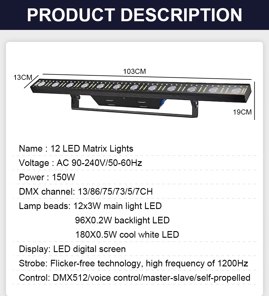 Modo de control: Control de señal DMX512, RDM, control de voz, autopropulsado, maestro-esclavo