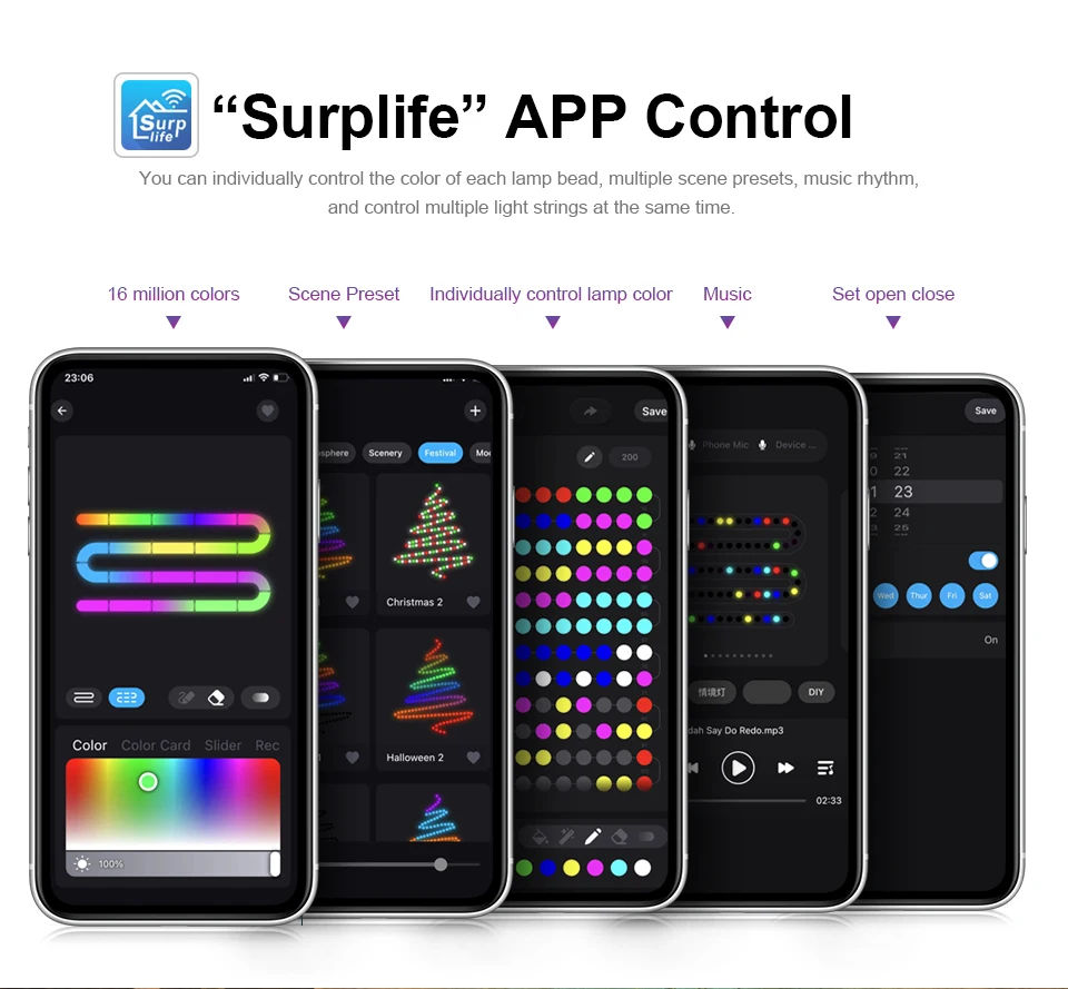 El controlador puede controlar de manera defectuosa de manera conveniente.Hay muchos colores de luz y muchos modos de luz para que usted elija, niveles de brillo disponibles, modos de temporizador para satisfacer sus diferentes necesidades de uso.Cada LED de la exclusiva cadena de luces navideñas es una bombilla inteligente totalmente programable.Usted selecciona diseños de luces y animaciones prefabricados desde la aplicación o incluso programa su propio diseño para que coincida con los colores de sus equipos deportivos favoritos, una animación única y más.