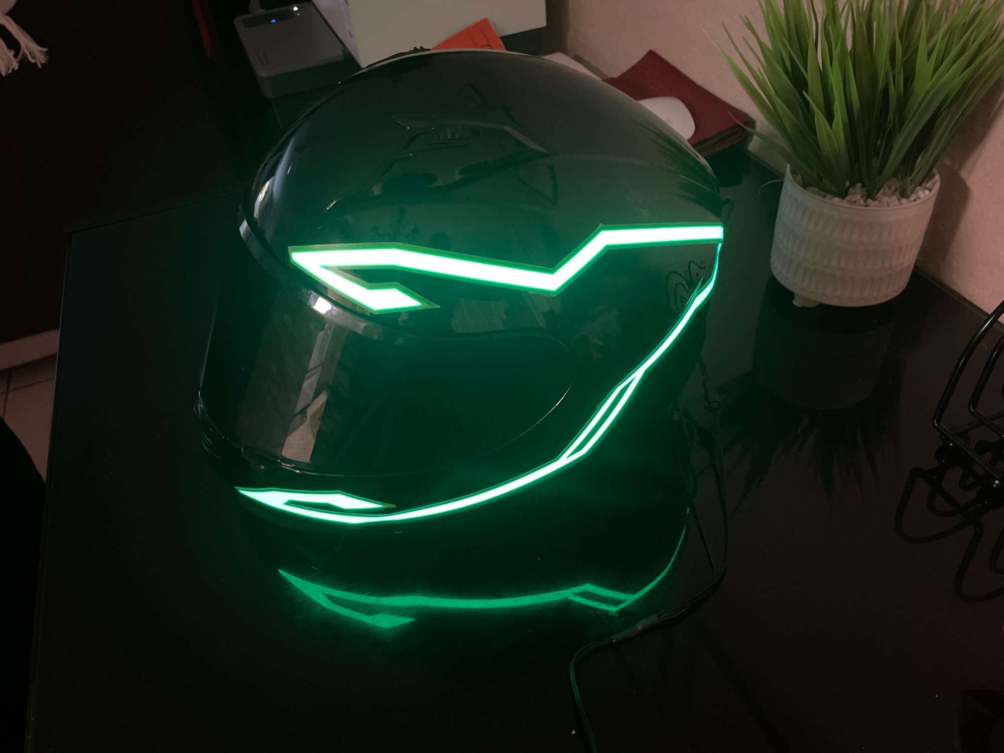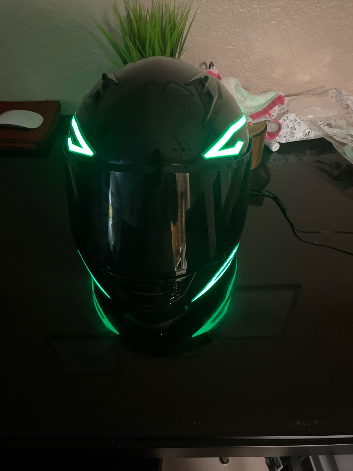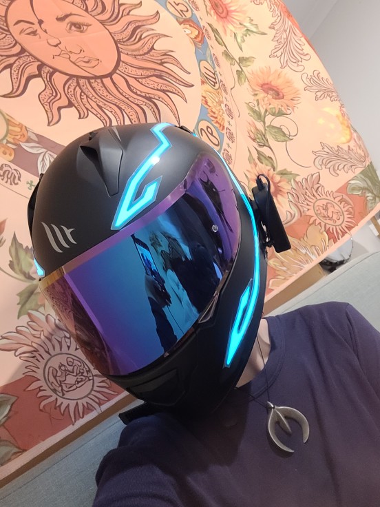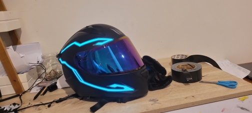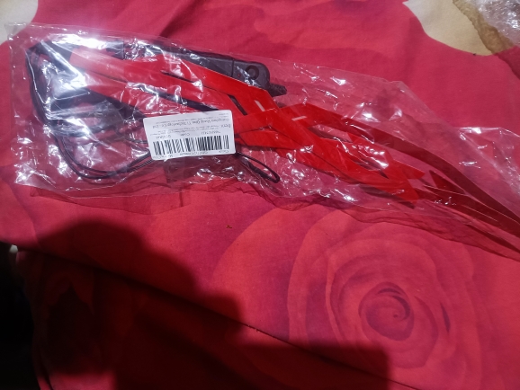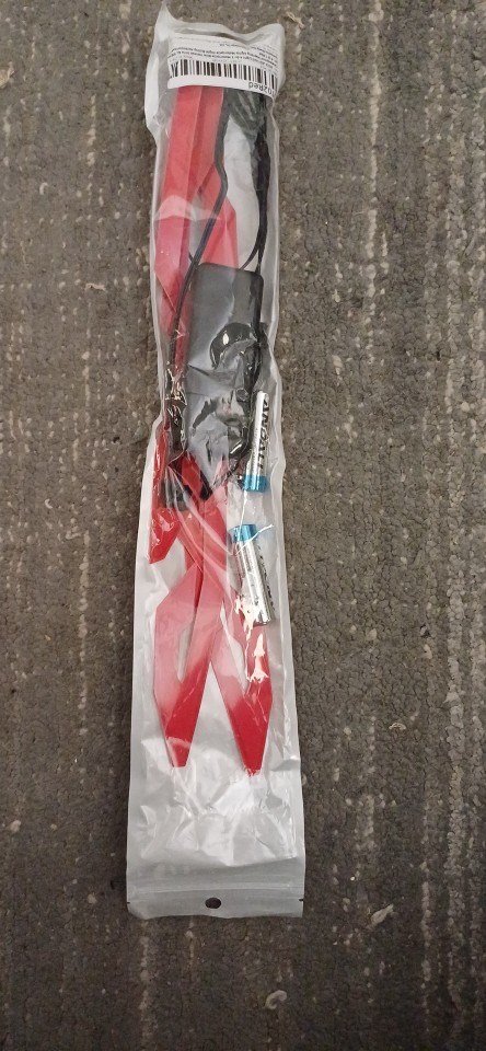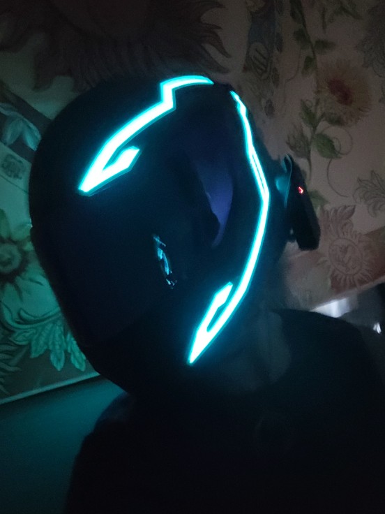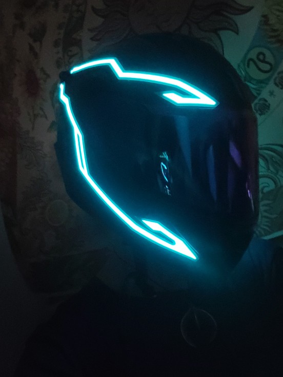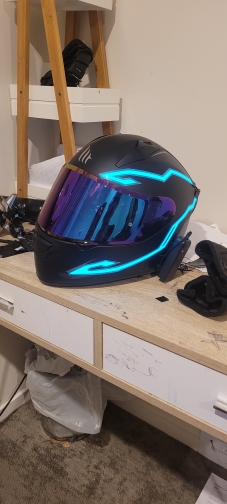 Se ha retrasado en llegar, pero no me importa mucho. Parece bastante pegajoso cuando se ve de cerca, pero se ve muy enfermo cuando está encendido y está oscuro. La batería es realmente voluminosa y tiene un clip, acabo de hacer un bucle de cinta adhesiva para recortarla, lo que funcionó bien. No he montado con él todavía, un poco preocupado por si se hace llorar. No viene con baterías, pero afortunadamente ya tenía algunas recargables.