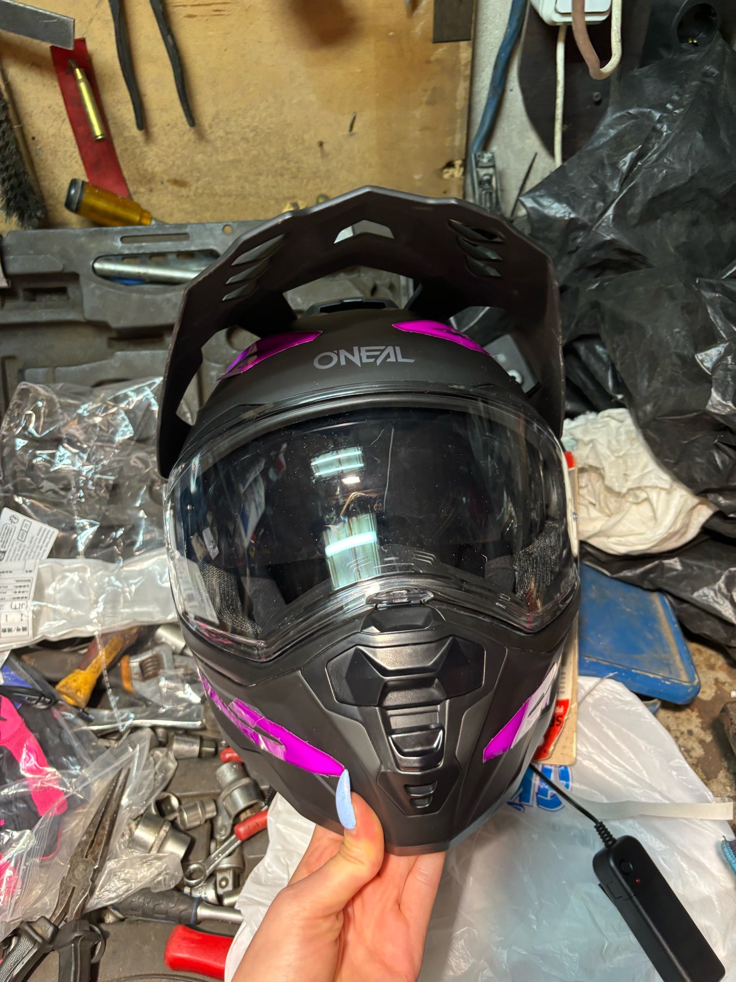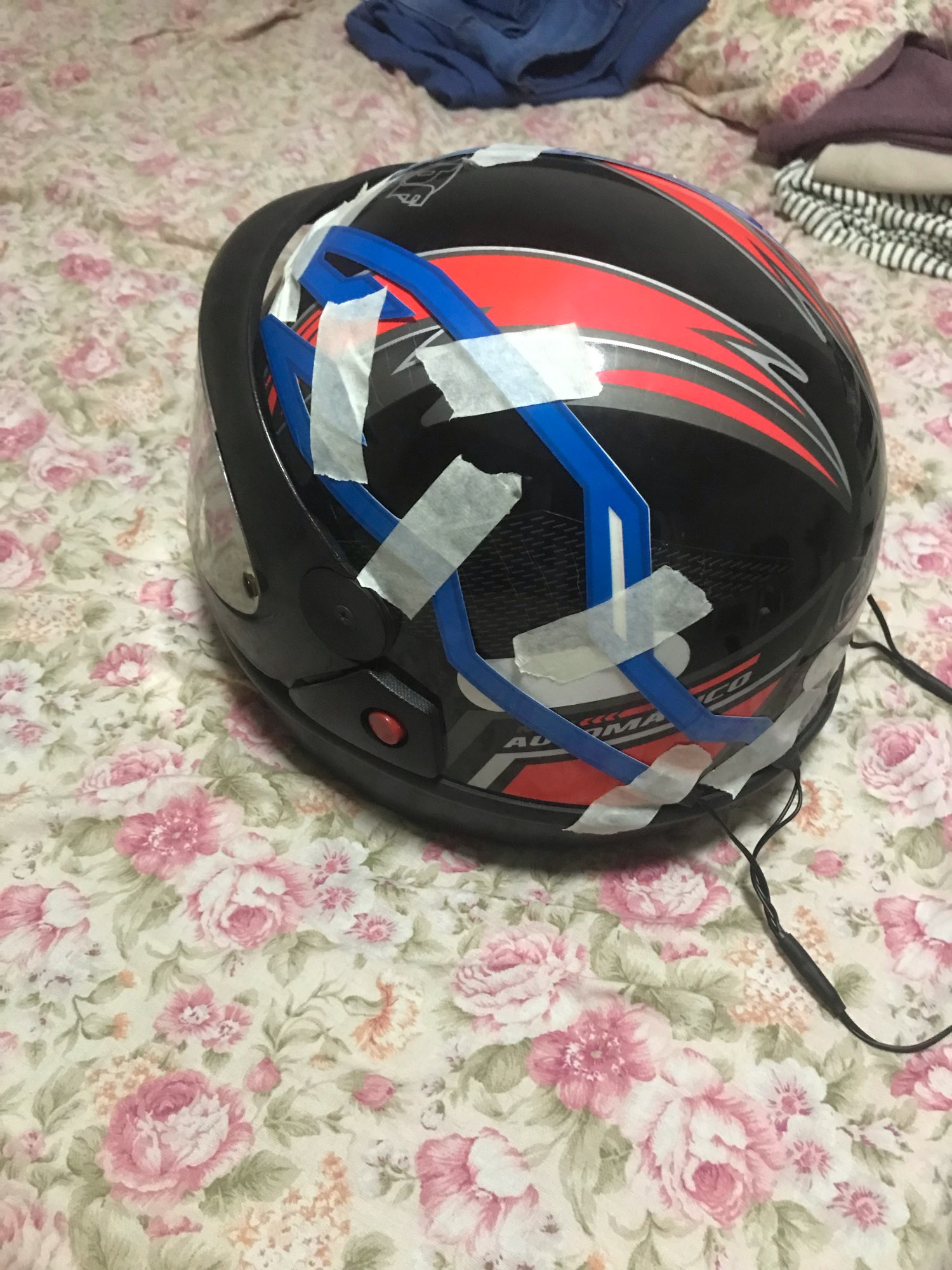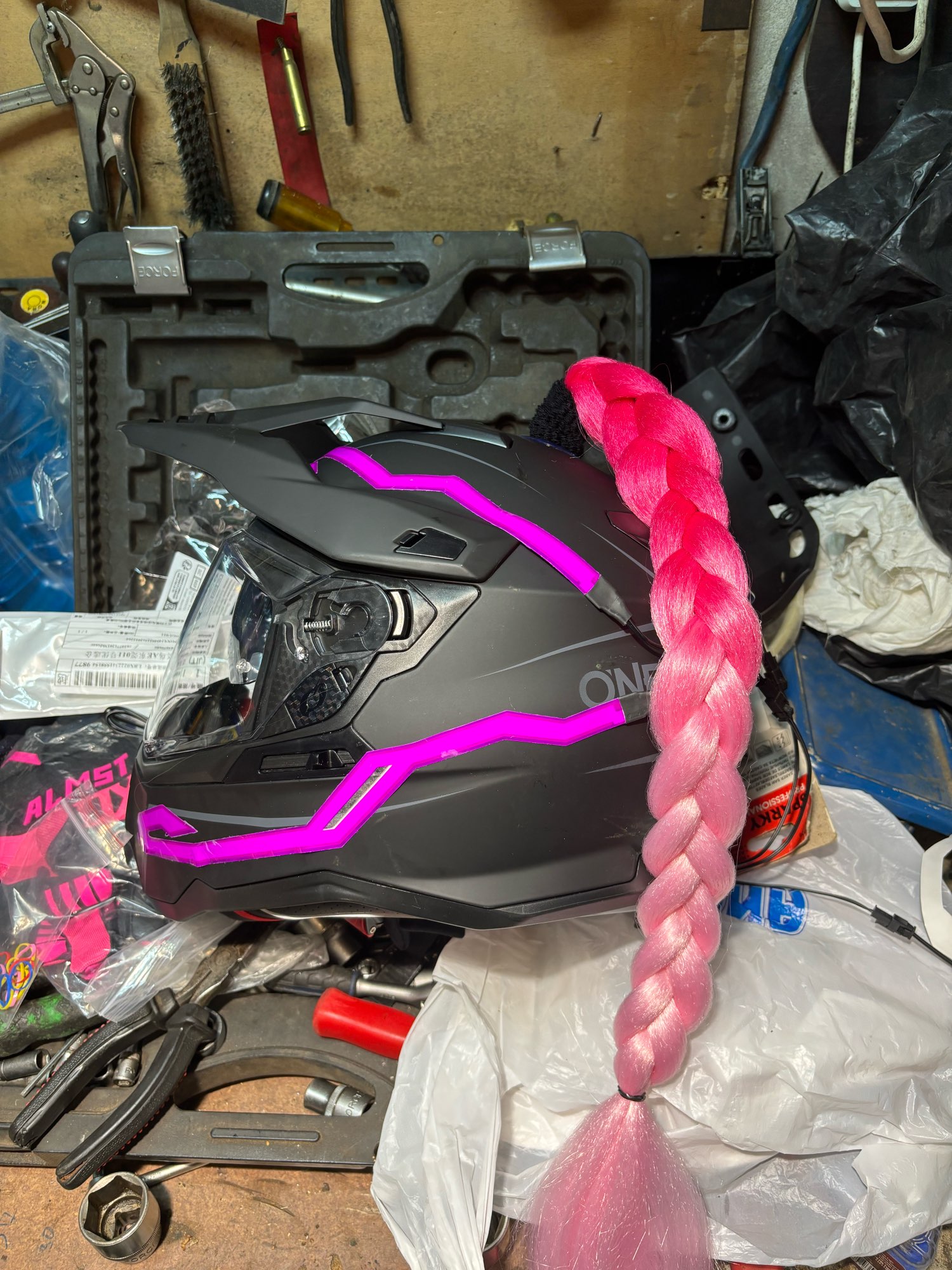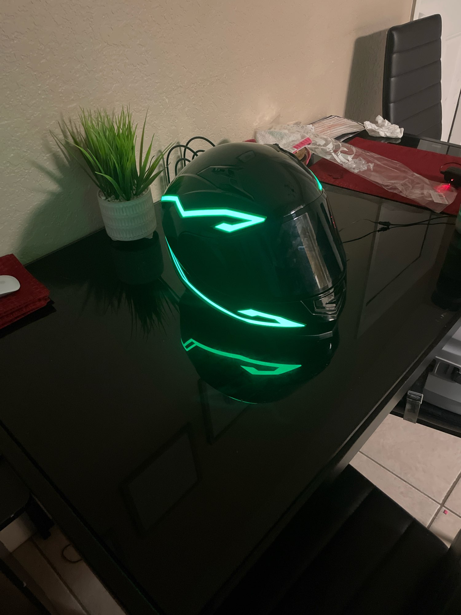 Se ha retrasado en llegar, pero no me importa mucho. Parece bastante pegajoso cuando se ve de cerca, pero se ve muy enfermo cuando está encendido y está oscuro. La batería es realmente voluminosa y tiene un clip, acabo de hacer un bucle de cinta adhesiva para recortarla, lo que funcionó bien. No he montado con él todavía, un poco preocupado por si se hace llorar. No viene con baterías, pero afortunadamente ya tenía algunas recargables.
