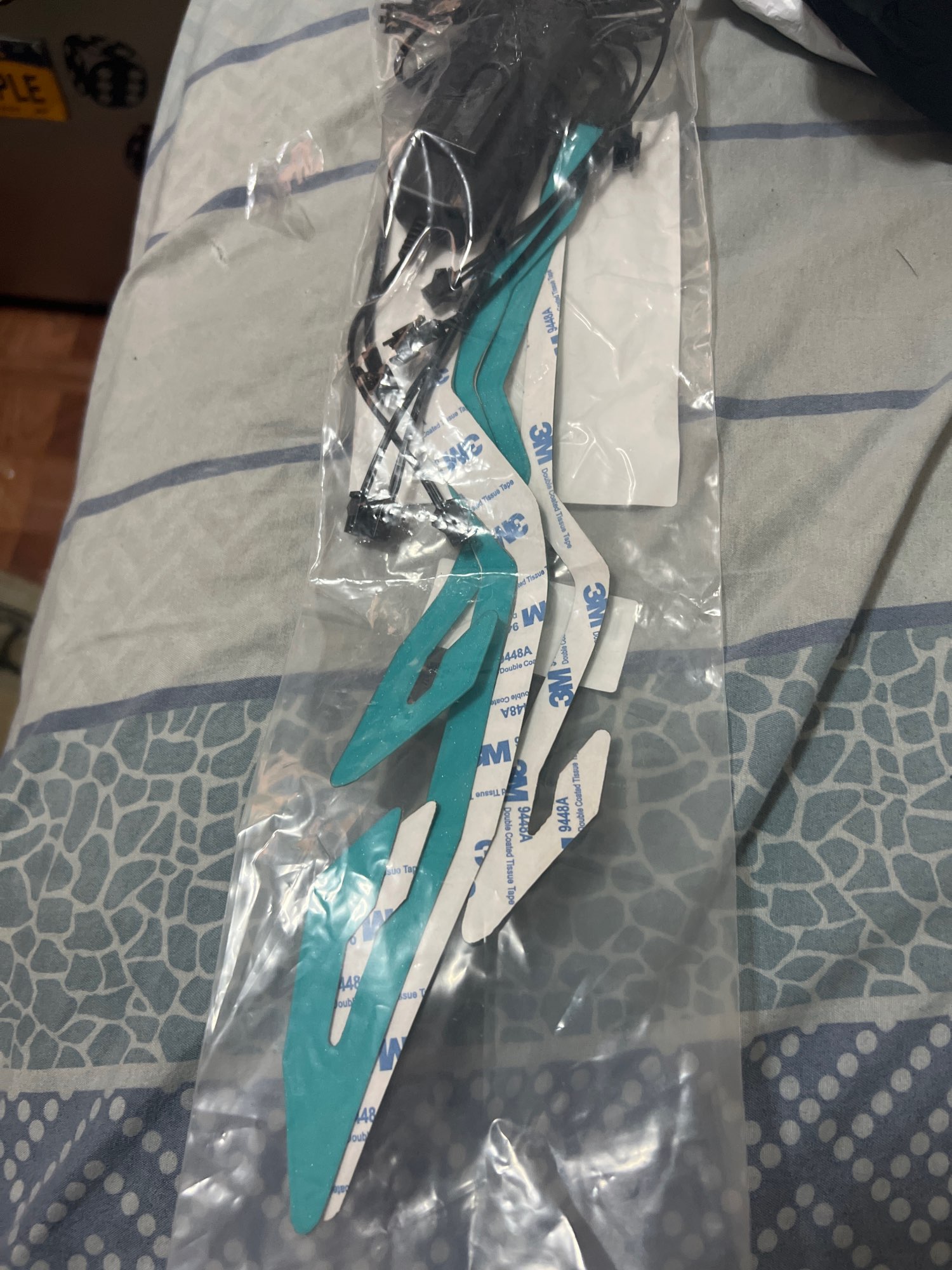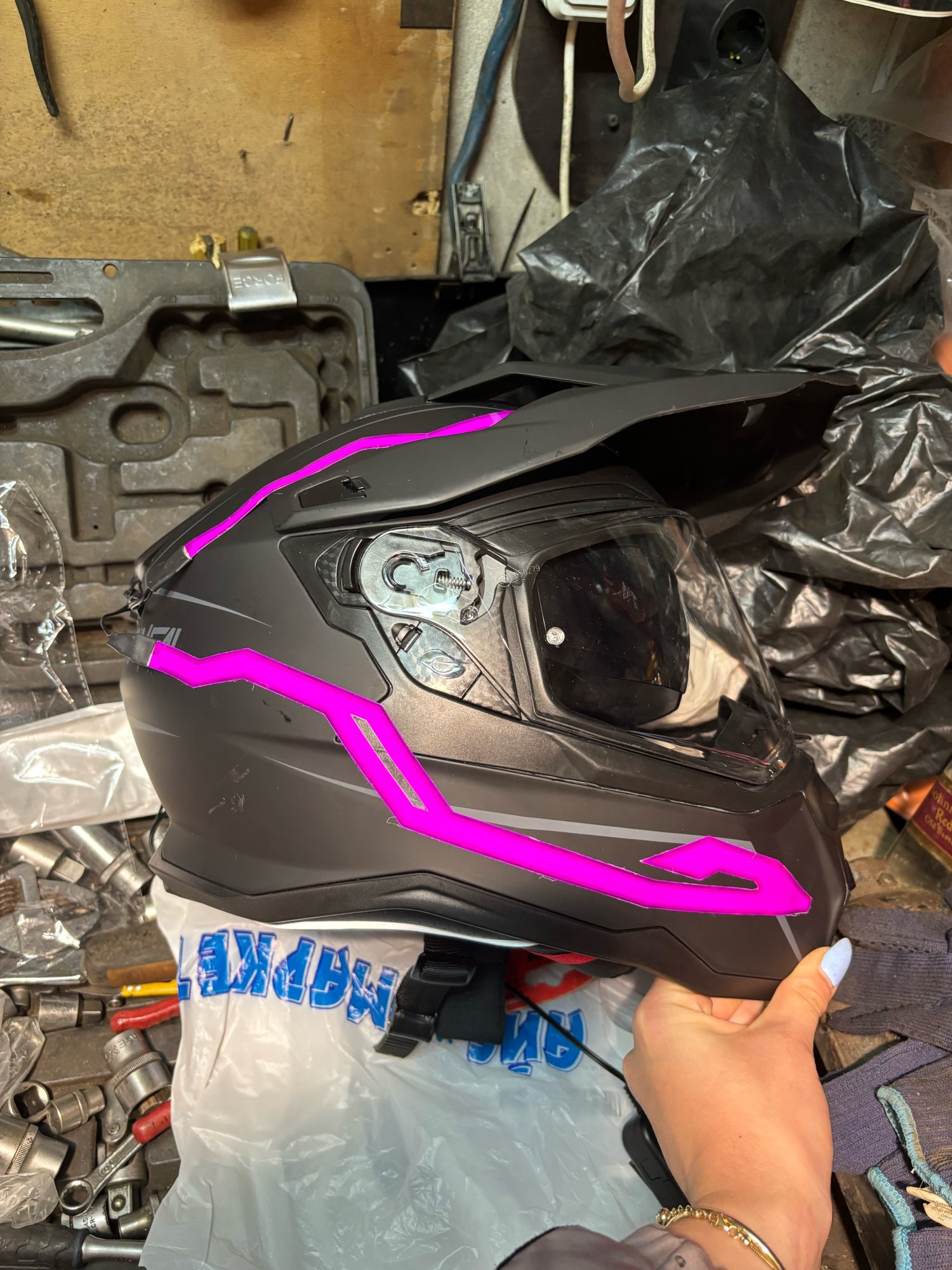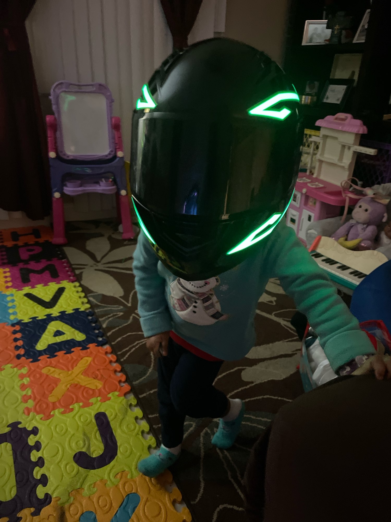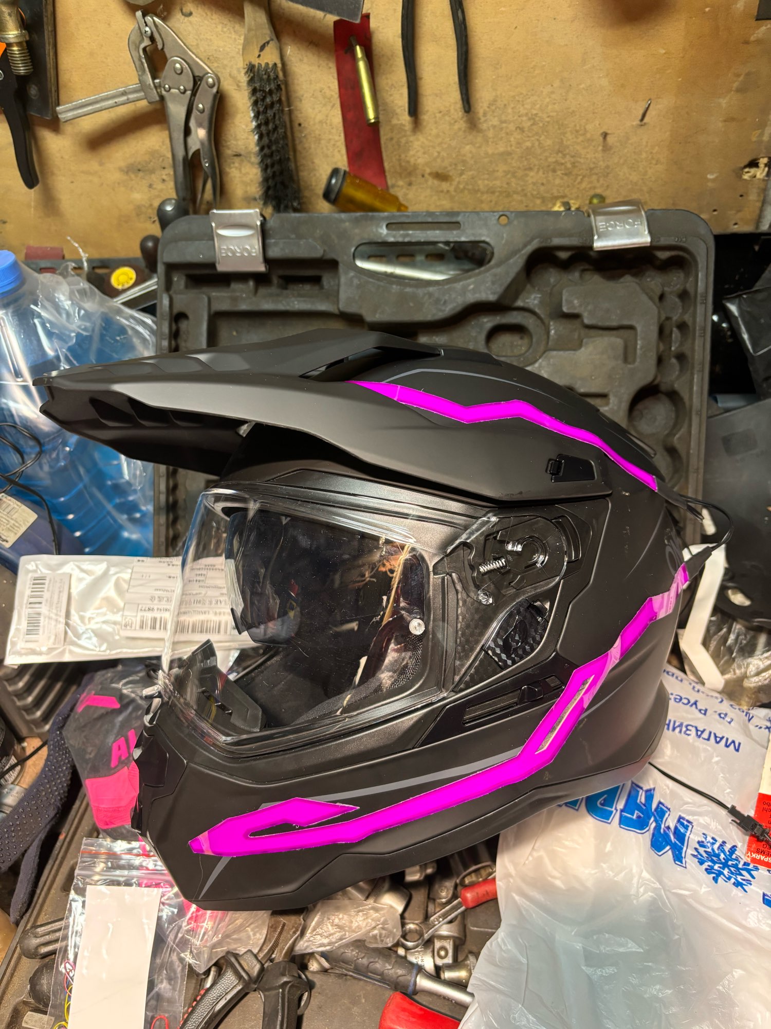 Se ha retrasado en llegar, pero no me importa mucho. Parece bastante pegajoso cuando se ve de cerca, pero se ve muy enfermo cuando está encendido y está oscuro. La batería es realmente voluminosa y tiene un clip, acabo de hacer un bucle de cinta adhesiva para recortarla, lo que funcionó bien. No he montado con él todavía, un poco preocupado por si se hace llorar. No viene con baterías, pero afortunadamente ya tenía algunas recargables.