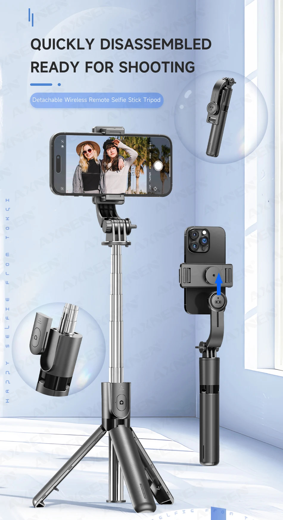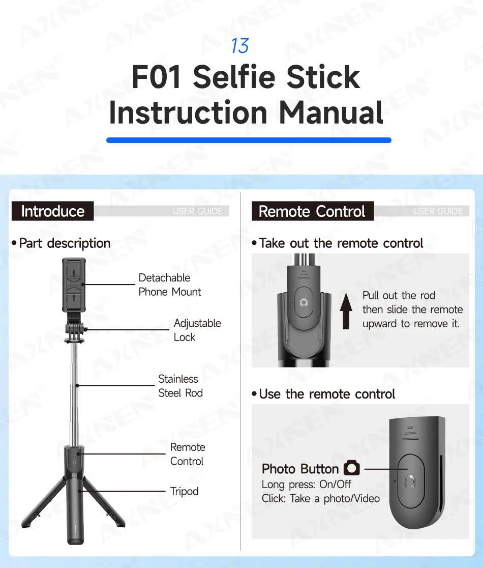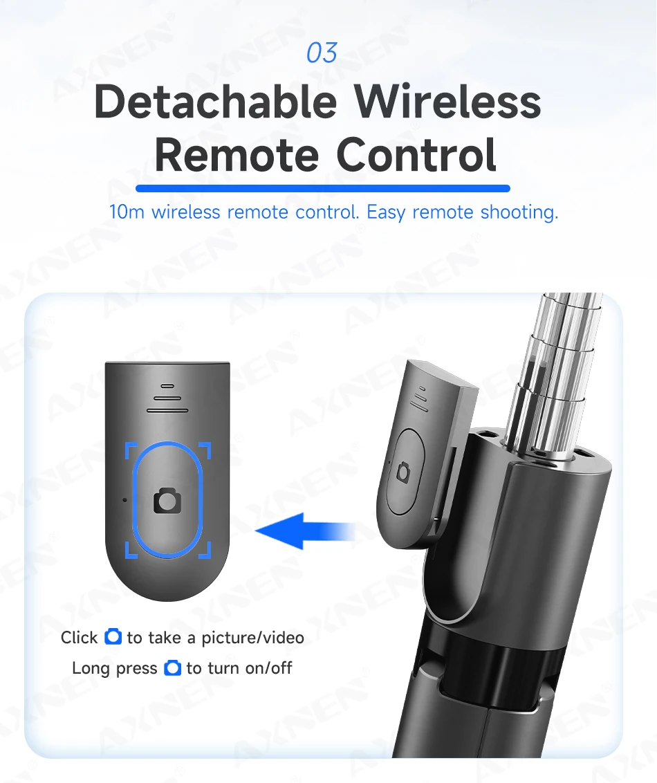 El trípode para palo selfie F01 es una herramienta 2 en 1 para tomar fotografías y vídeos.Funciona con la mayoría de teléfonos inteligentes y cámaras de acción.El stick tiene 6 secciones extensibles, una 360° Soporte giratorio para teléfono y control remoto Bluetooth desmontable.Es muy ligero y fácil de transportar, perfecto para viajes, vlogging y uso diario.