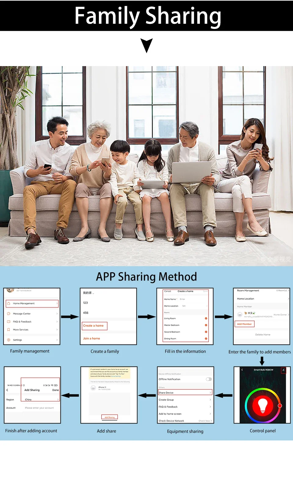 3. Control remoto y de grupo: Siga conectando esta bombilla inteligente WiFi con su red doméstica (solo admite Wifi de 2,4 GHz), puede controlar de forma remota la bombilla inteligente en su teléfono inteligente Simular cuando salga de casa. La función de control de grupo le permite controlar más de una bombilla inteligente al mismo tiempo para la configuración de la escena.