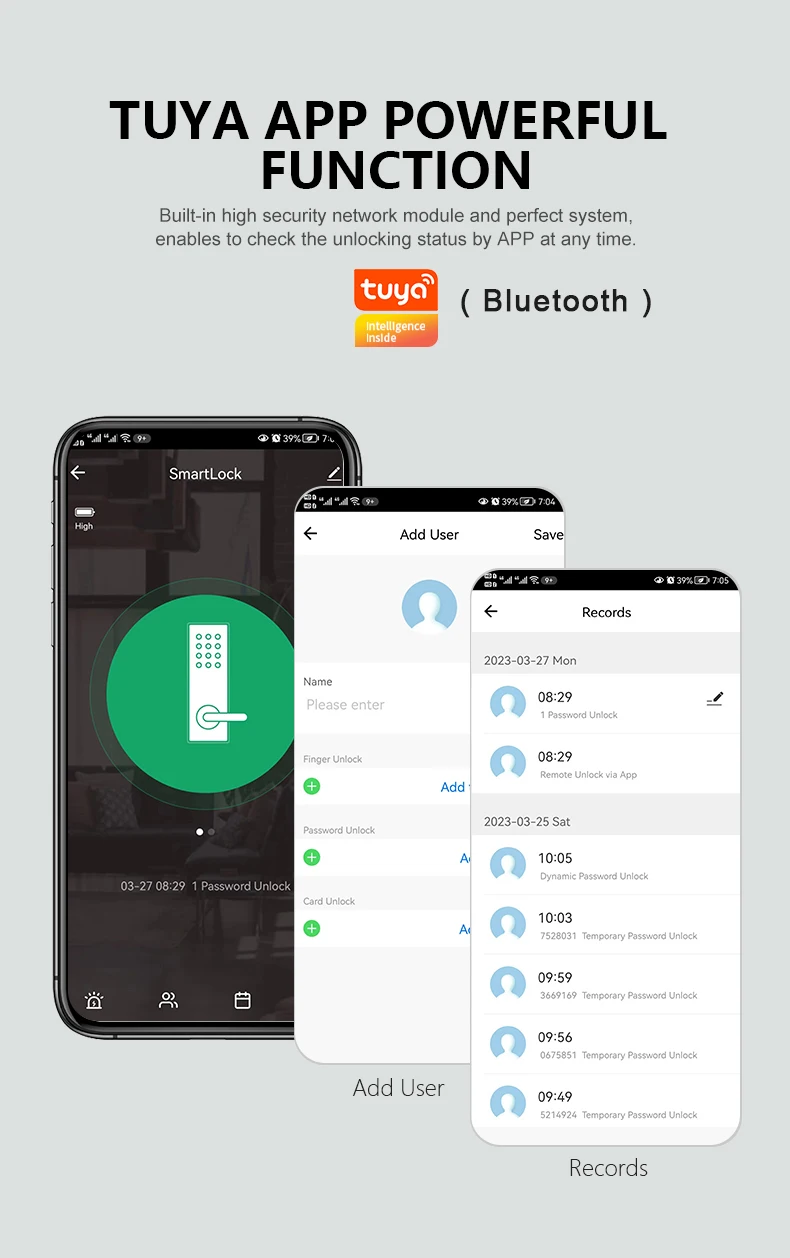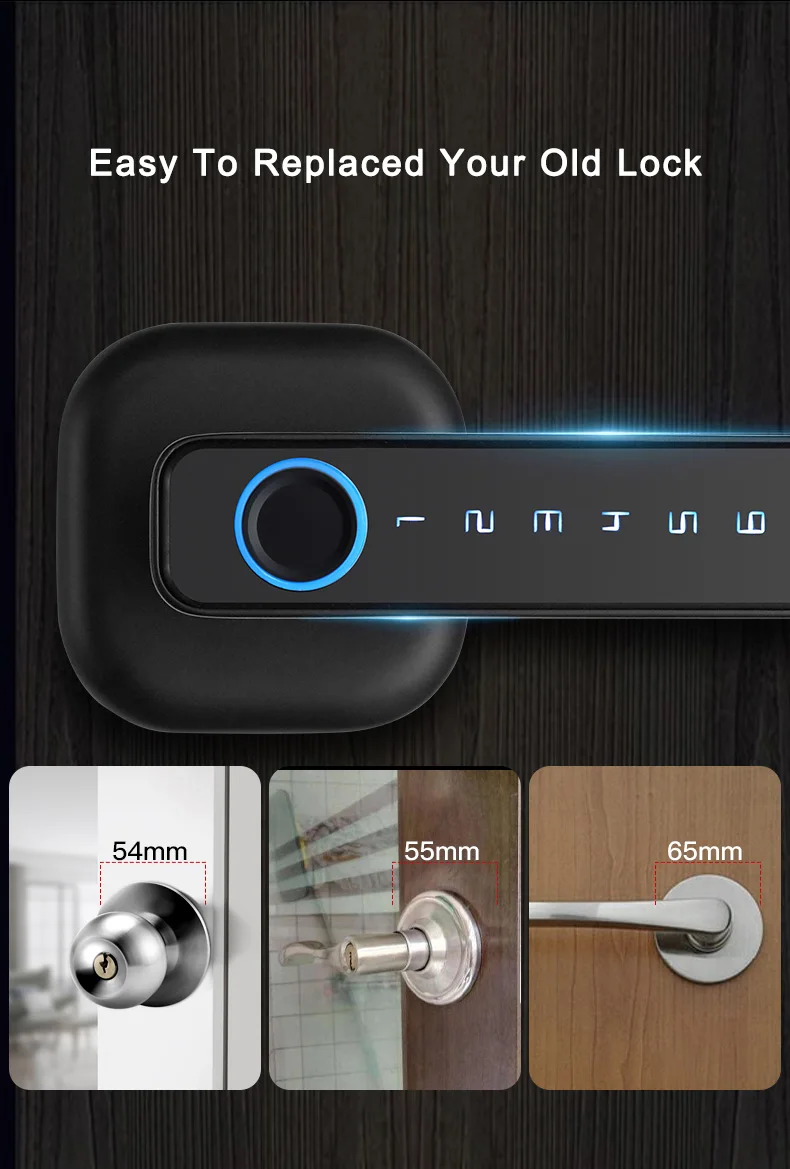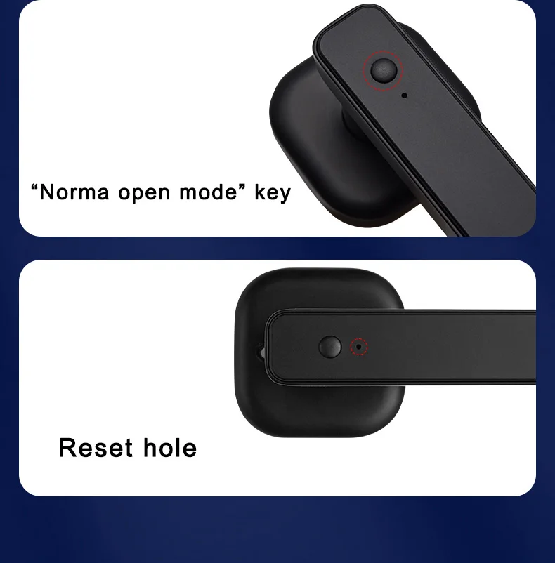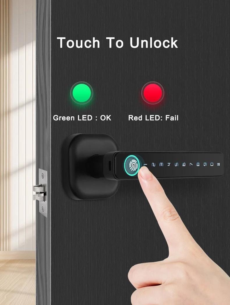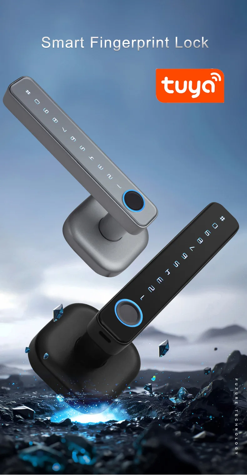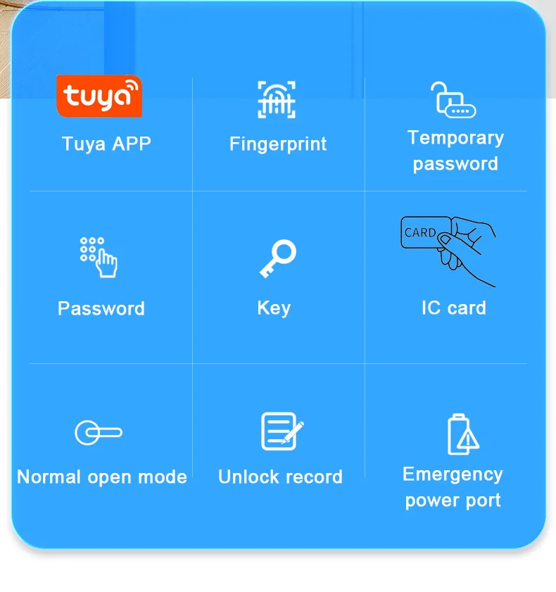 • Modo de desbloqueo: huella digital/contraseña/tarjeta IC/llave mecánica (2 piezas)/aplicación Tuya (Bluetooth)