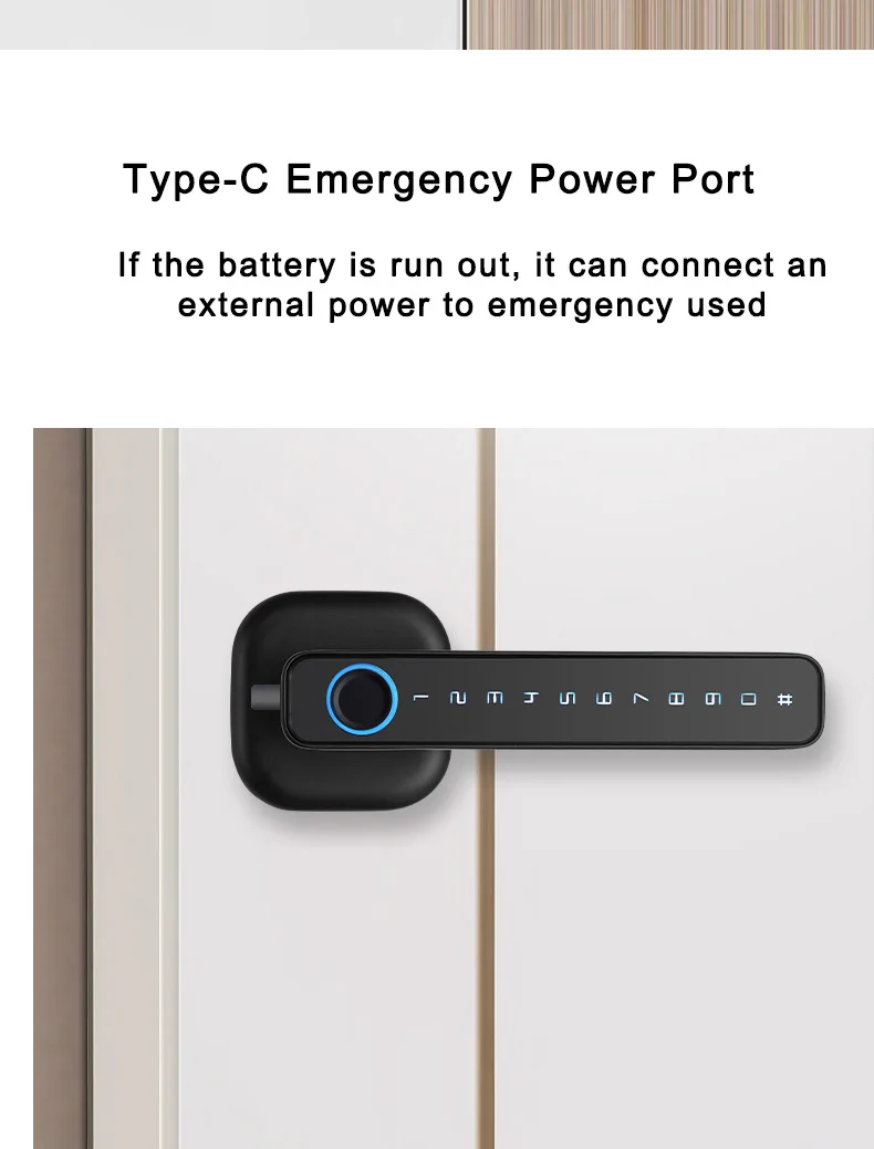 • Con puerto tipo C para uso de emergencia (no es para carga, solo para uso de emergencia, esta cerradura no admite carga)