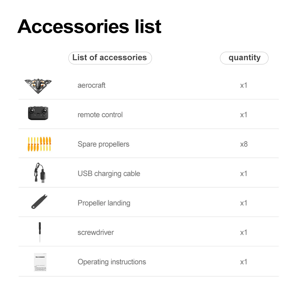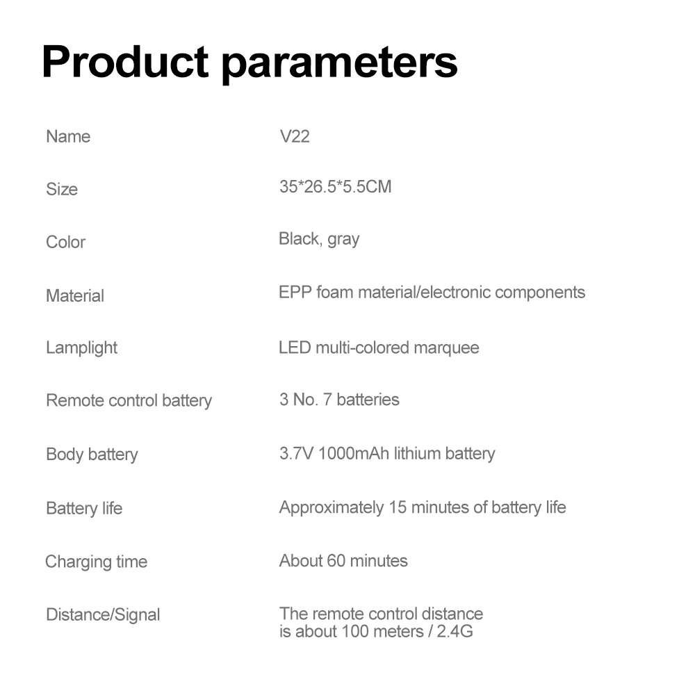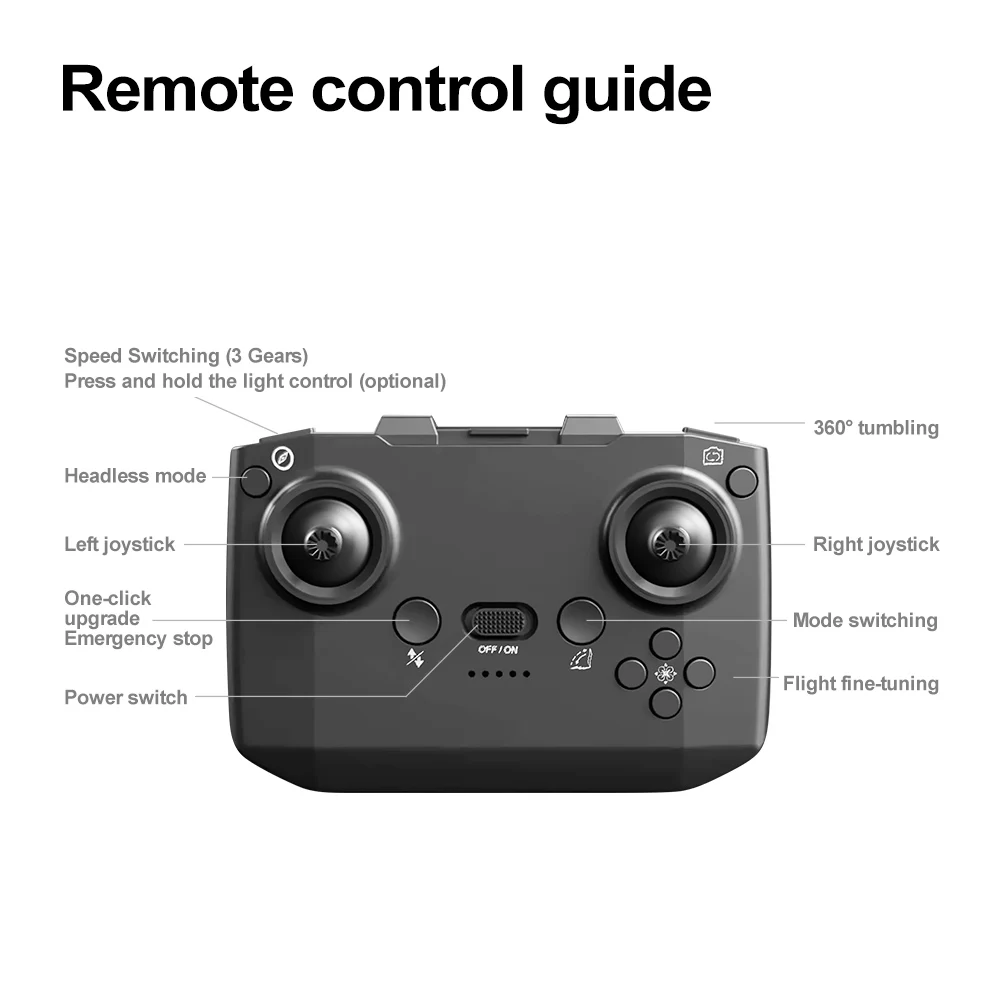 El control remoto se puede configurar para controlar la rotación hacia adelante, atrás, arriba, abajo, izquierda y derecha, vuelo lateral izquierdo y derecho, modo sin cabeza, vuelo en el aire, función de conmutación de velocidad rápida y lenta, 360° rodamiento acrobático y luces de colores geniales.