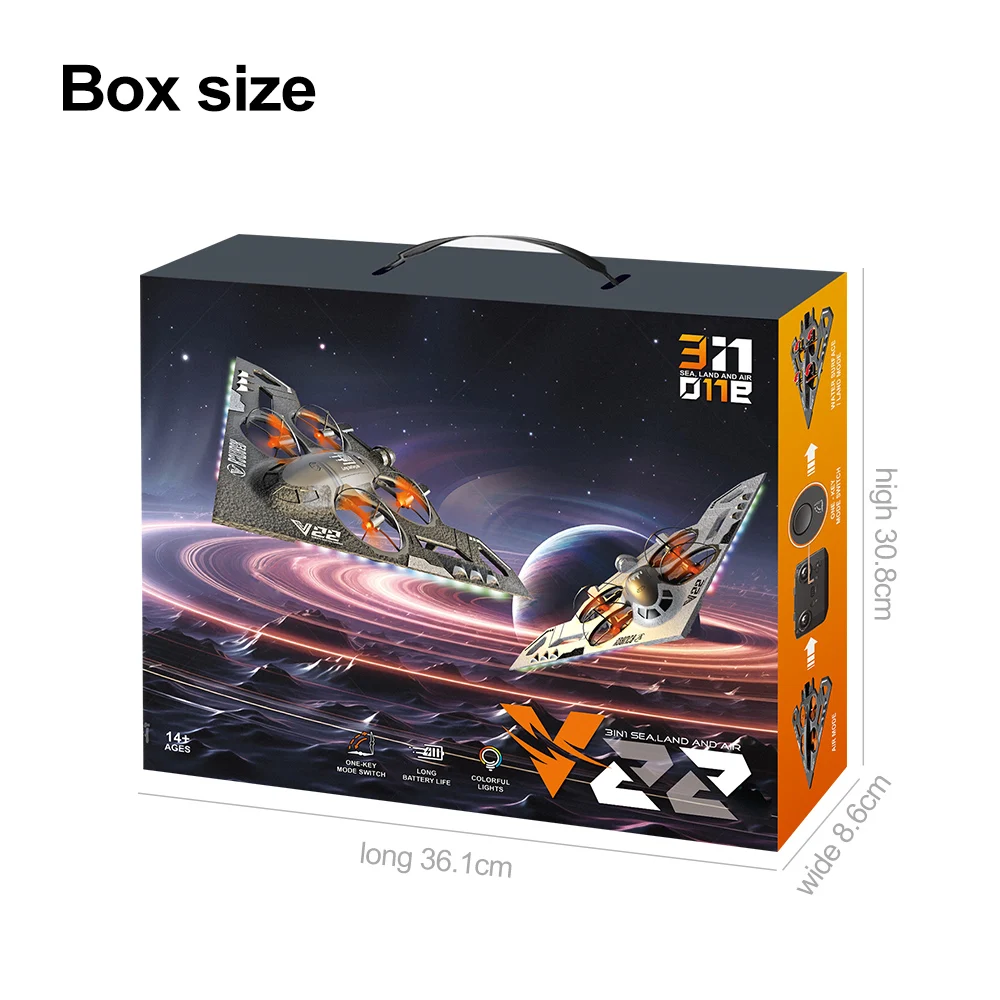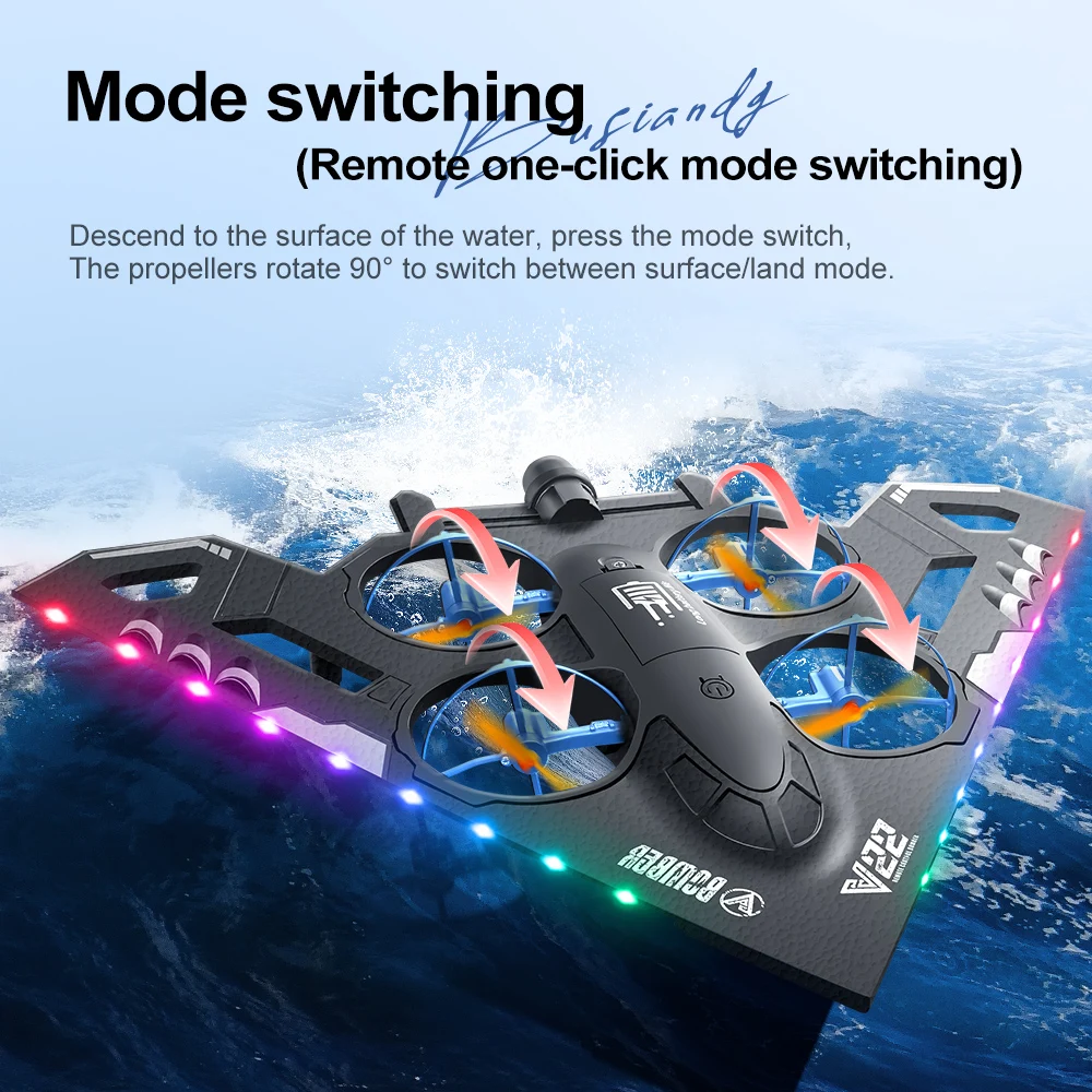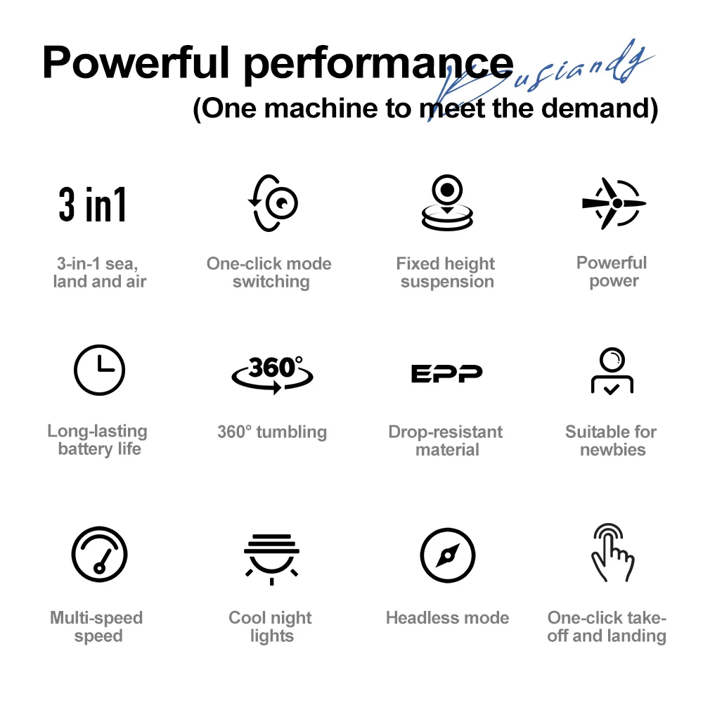 Este producto es un UAV de cuatro ejes con cuerpo de espuma con tres modos de mar, tierra y aire: «(volando en el aire) (desplazamiento terrestre) (nadar en el agua).