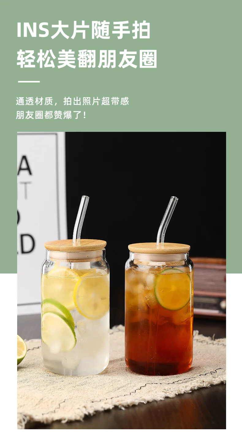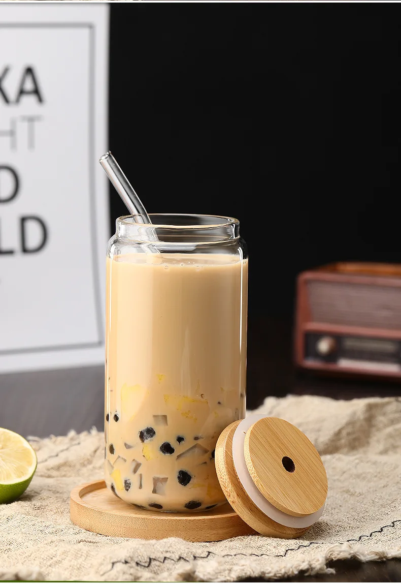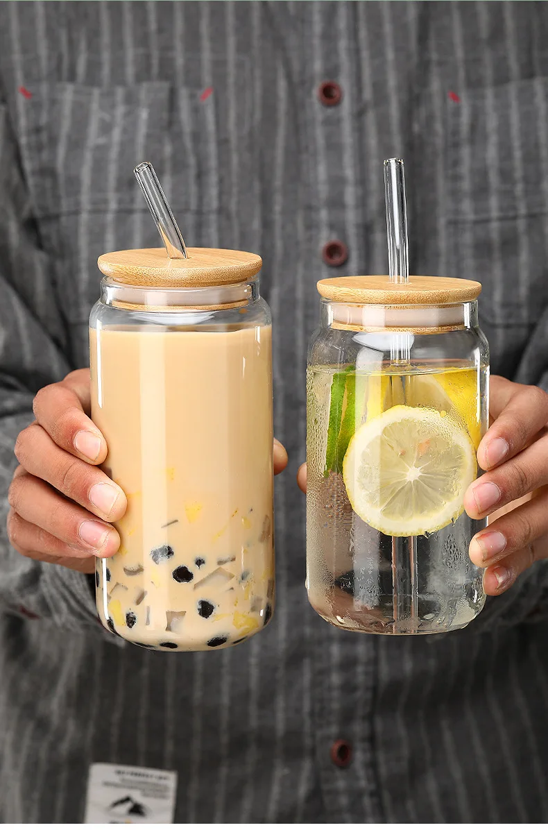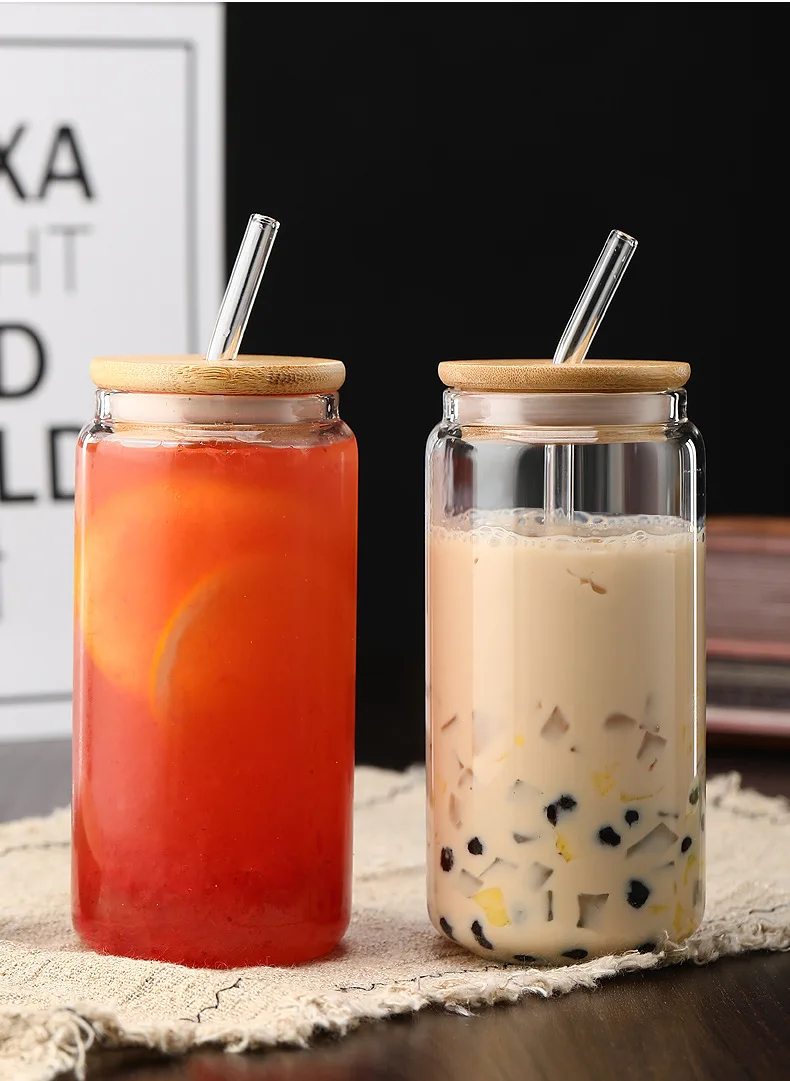 Vasos de vidrio de 450ml/550ml con tapas de bambú y pajita, 1 tarros de albañil, taza de café, lata de cerveza en forma para cóctel, leche, jugo, regalo de Cola