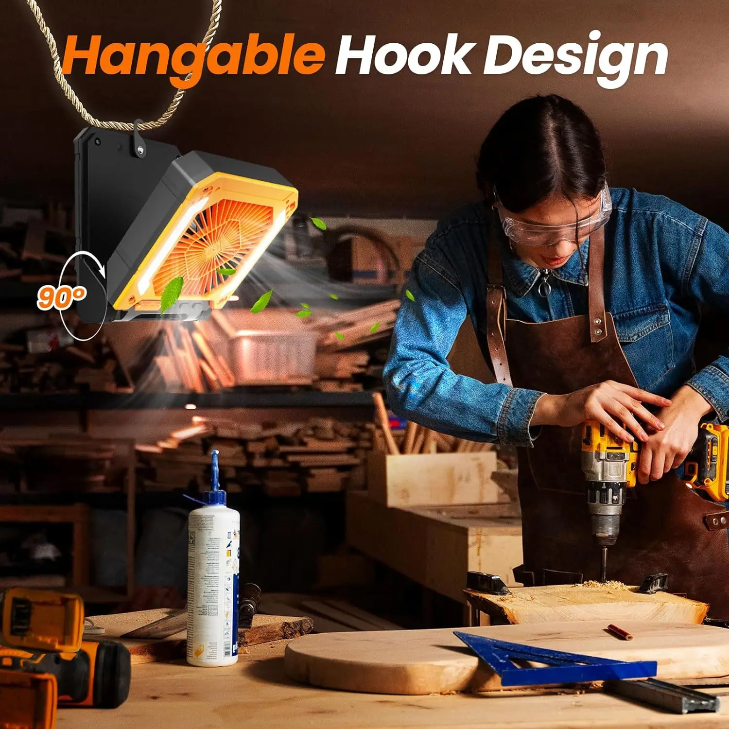 4. 【Ventilador con gancho para colgar】 Este ventilador inalámbrico puede ser 90° Se pliega para colocarlo como ventilador de piso o de mesa, pero también su gancho giratorio facilita la mejora del flujo de aire dentro de una tienda de campaña, una camioneta, un vehículo recreativo o una habitación pequeña en la circulación de aire.