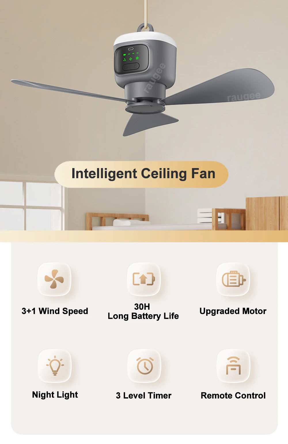 【Batería de duración ultralarga de 12000 mAh】Este ventilador de techo tiene una gran capacidad de batería de 12000 mAh y una batería de larga duración de 30 H.Es la mejor opción para acampar.