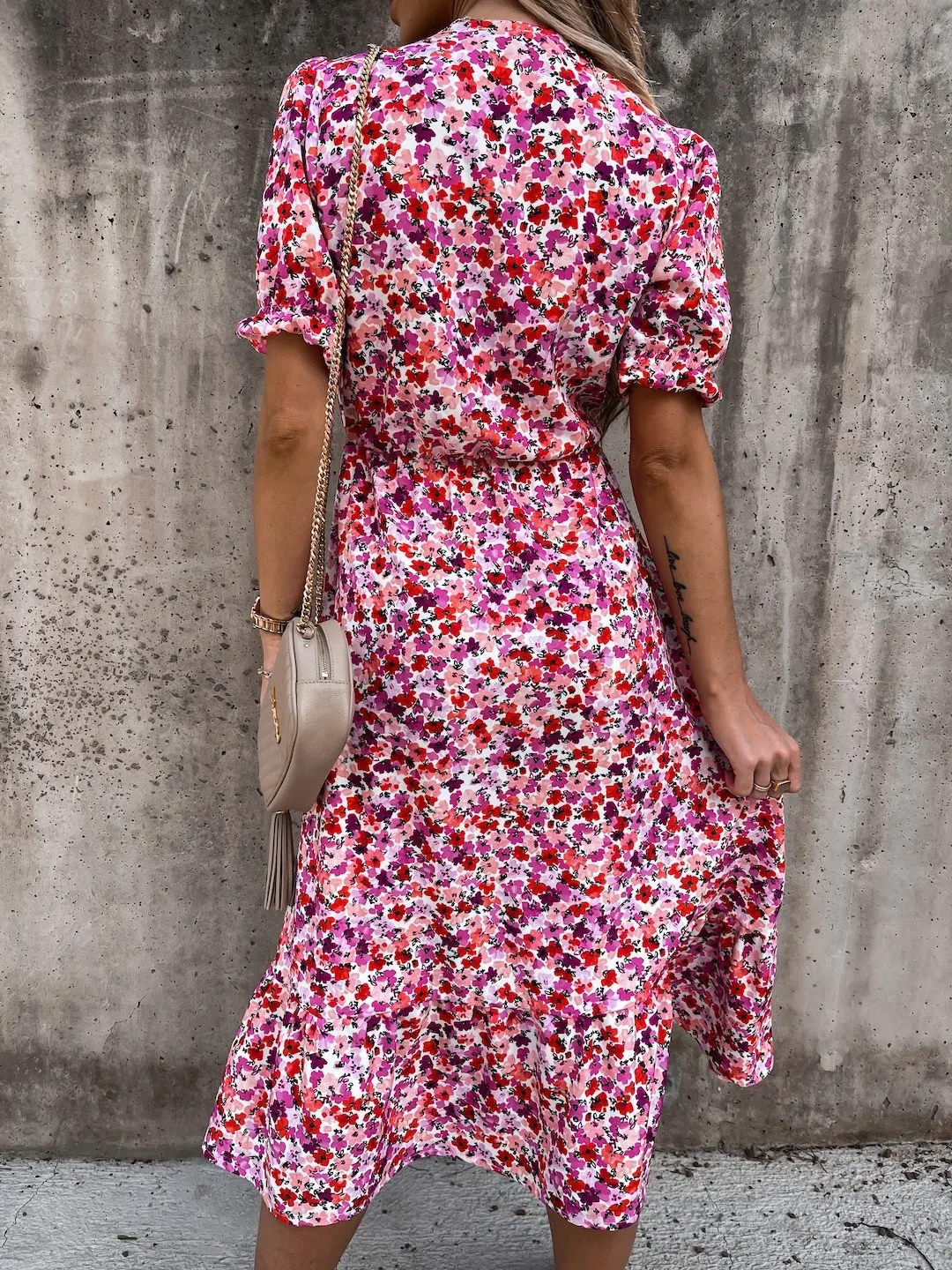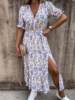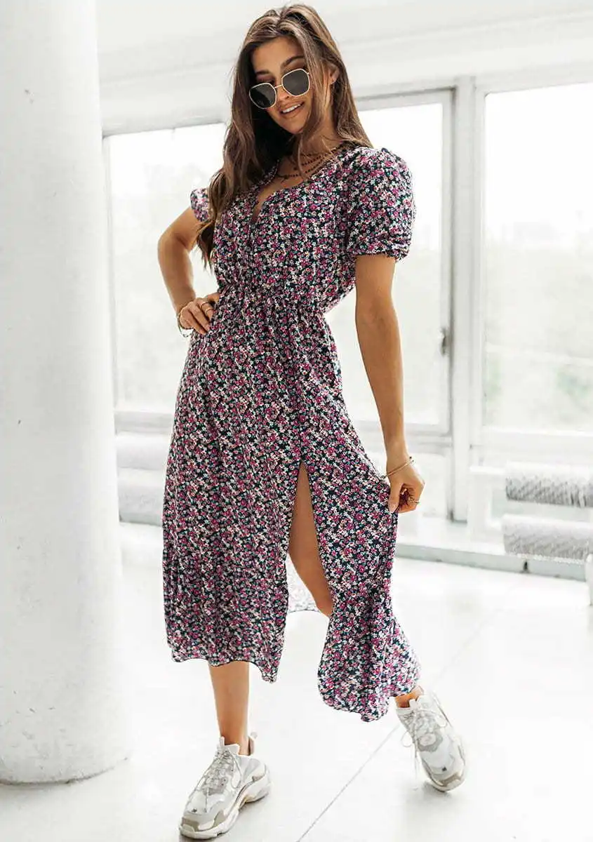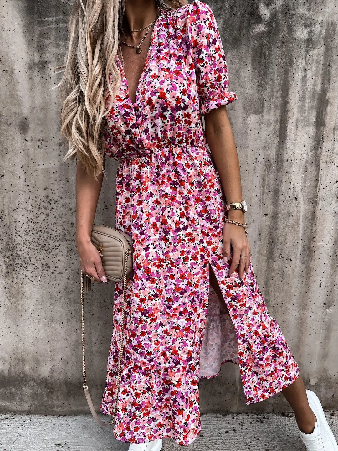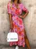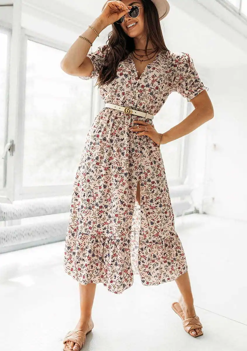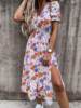Vestido de verano con estampado Floral para mujer, vestido largo con escote en V, abertura lateral, manga corta, botones, ajustado, fiesta, Primavera