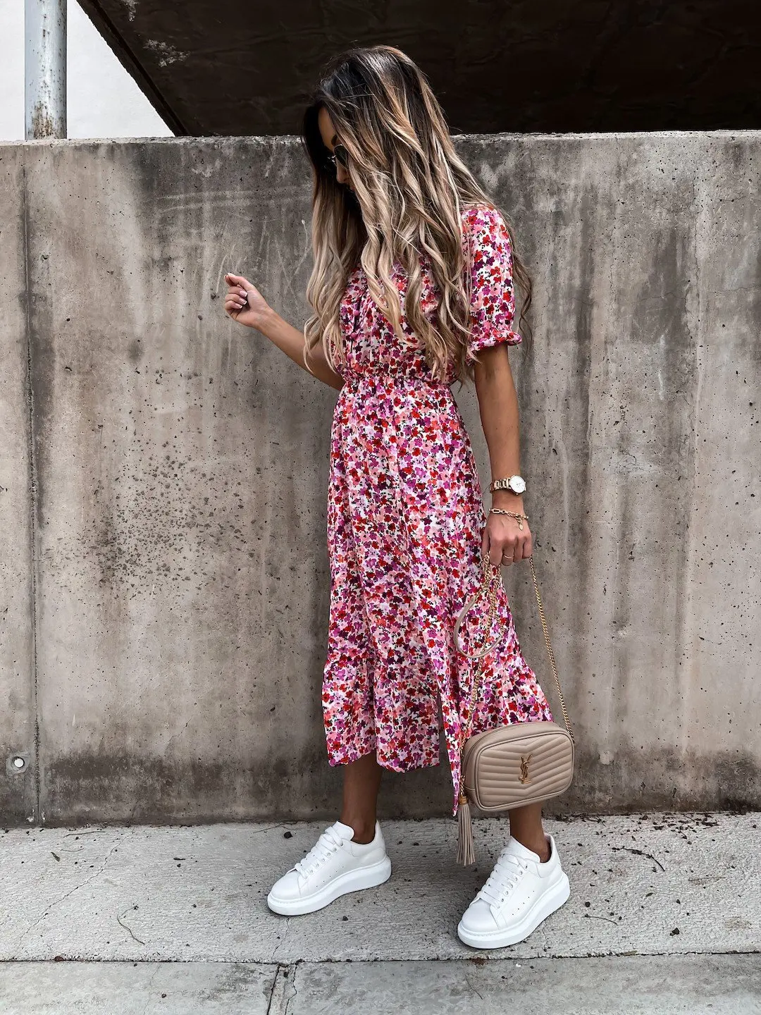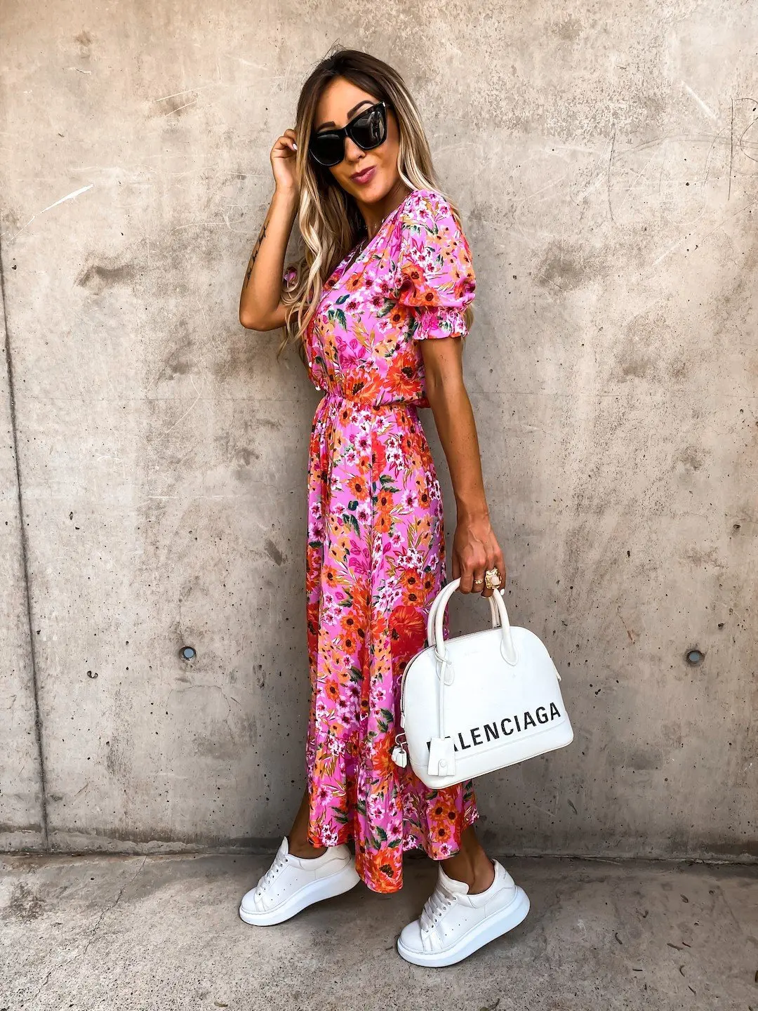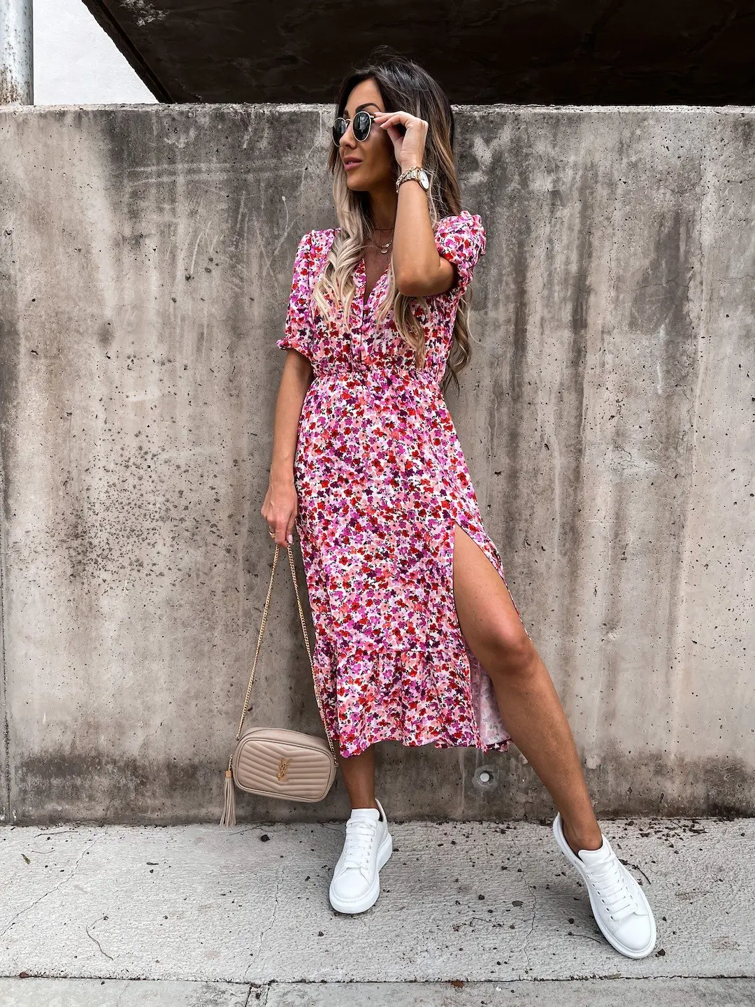 Vestido de verano con estampado Floral para mujer, vestido largo con escote en V, abertura lateral, manga corta, botones, ajustado, fiesta, Primavera