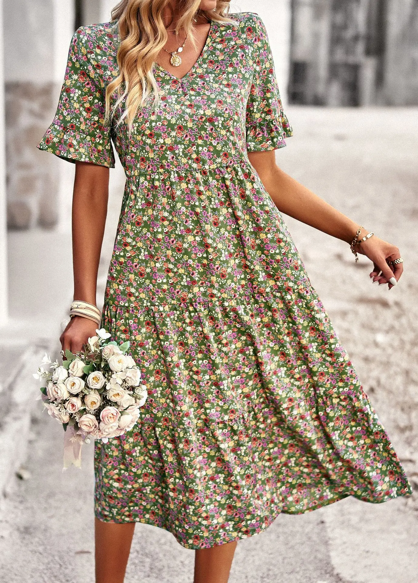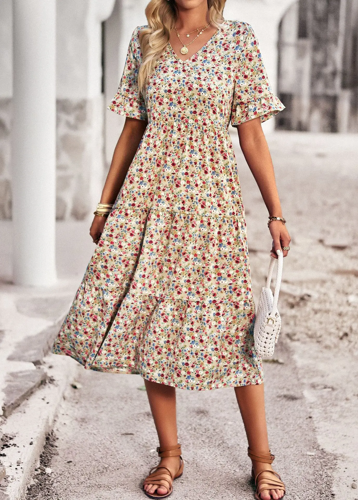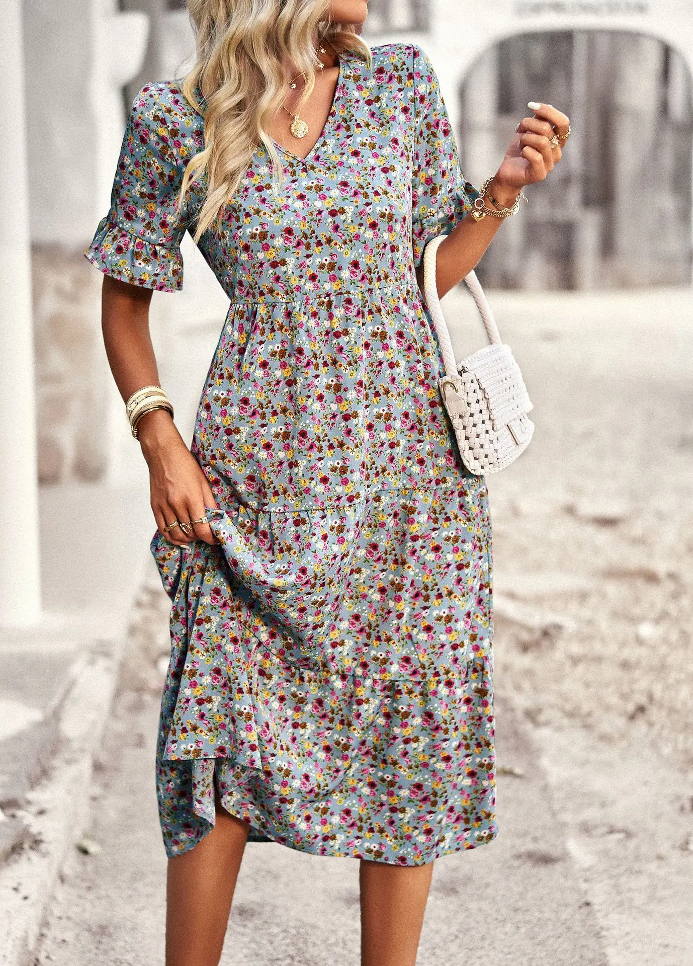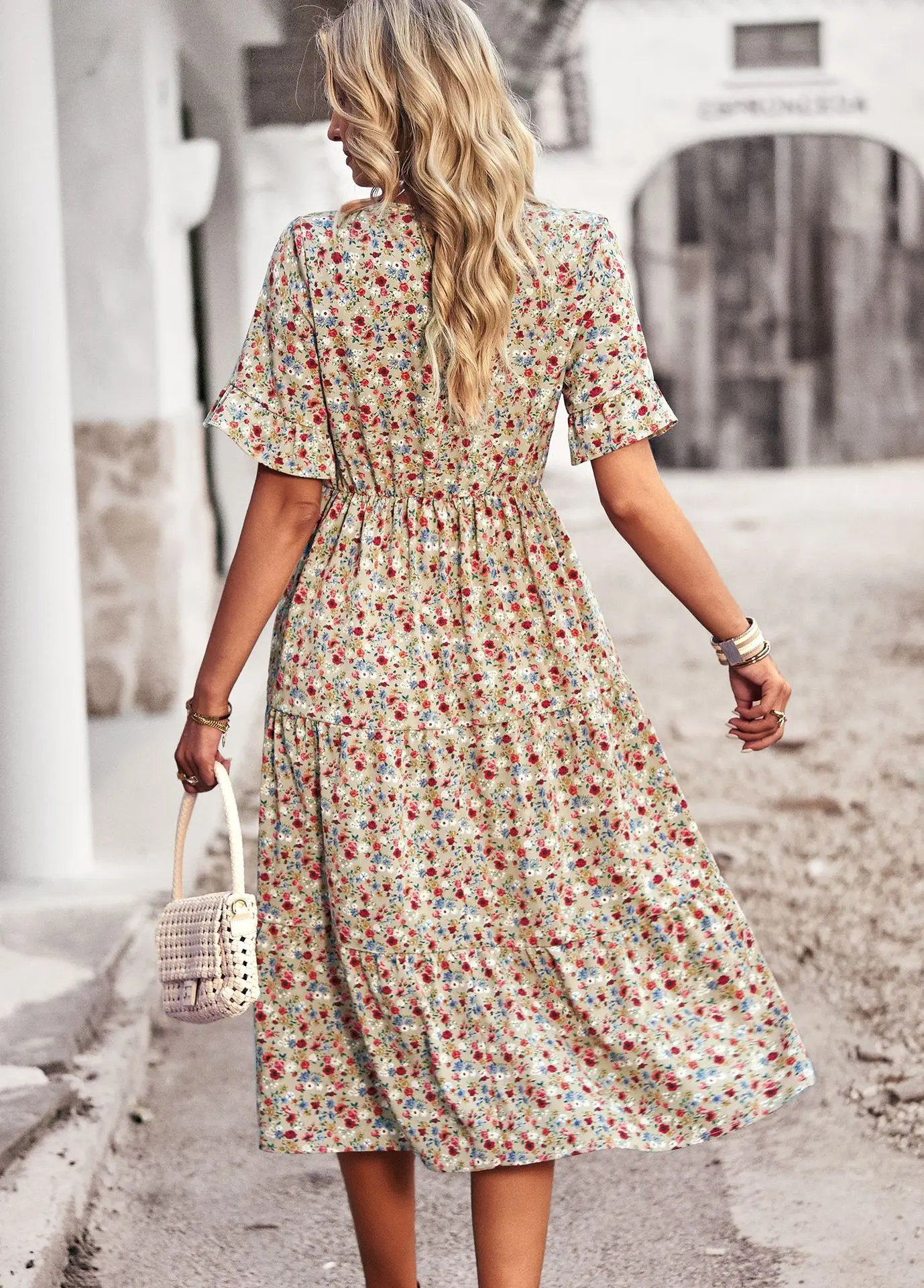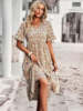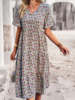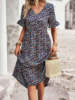 Vestido de verano de manga corta con cuello en V para mujer, estampado elegante, cintura alta, Floral, vacaciones