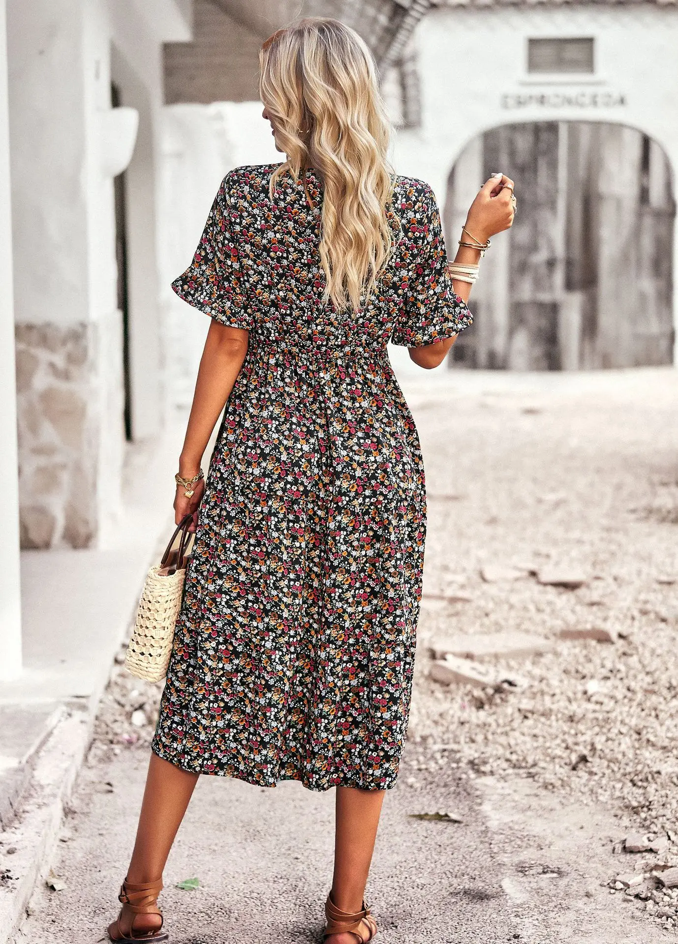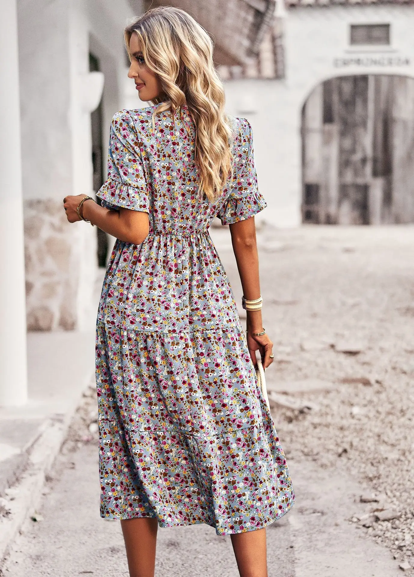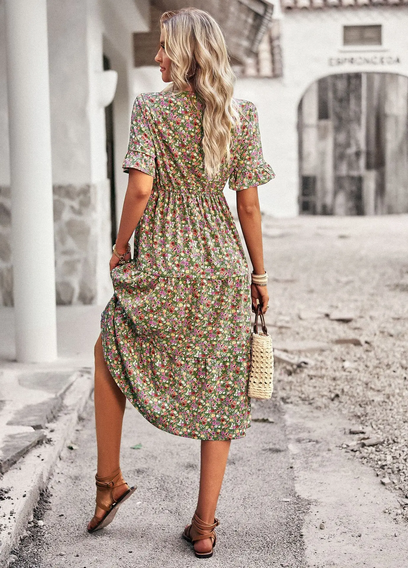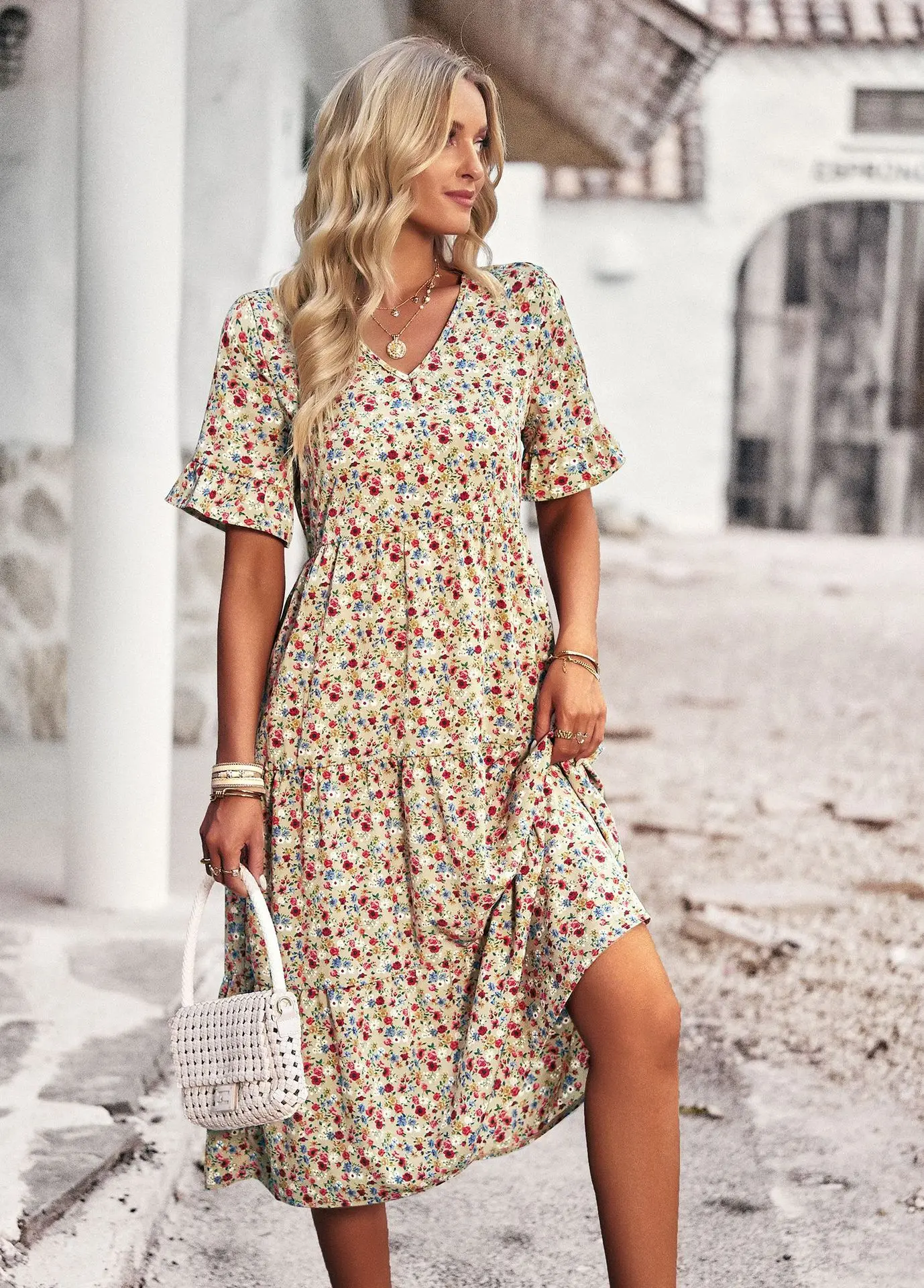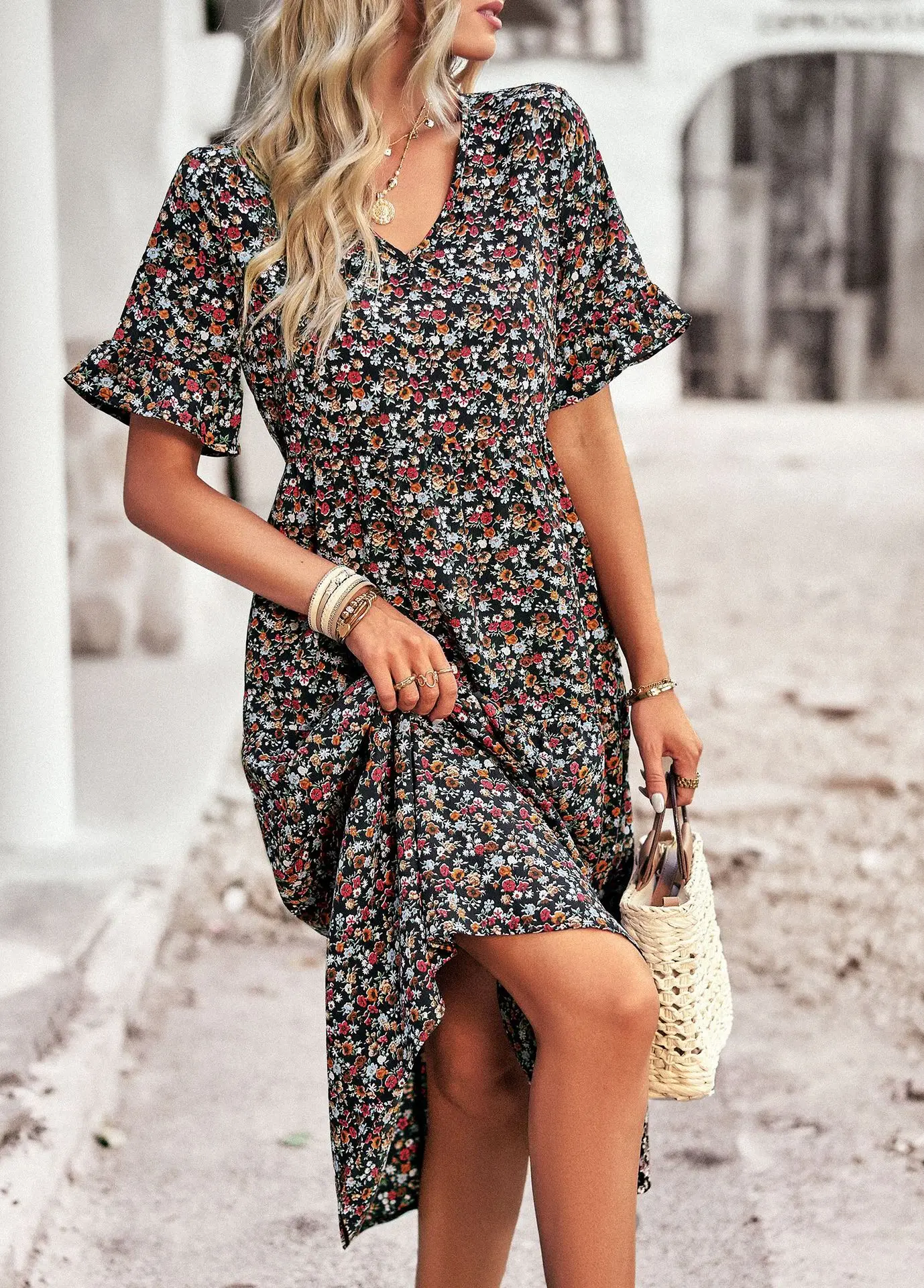 Vestido de verano de manga corta con cuello en V para mujer, estampado elegante, cintura alta, Floral, vacaciones